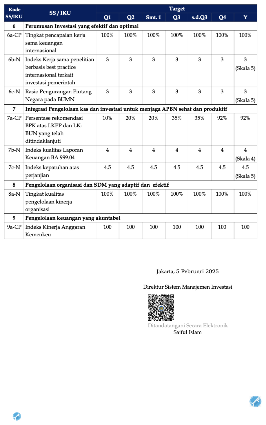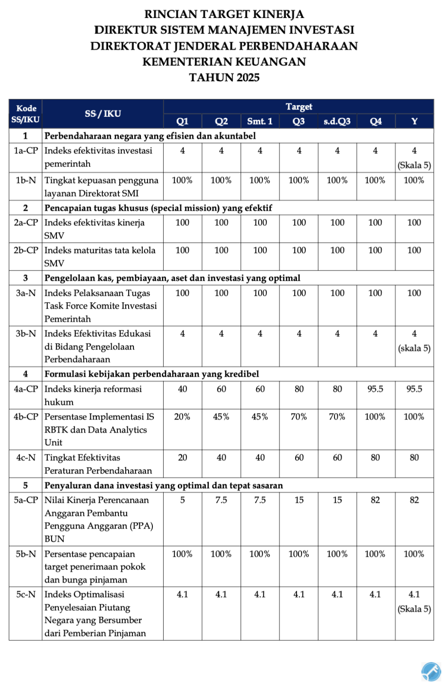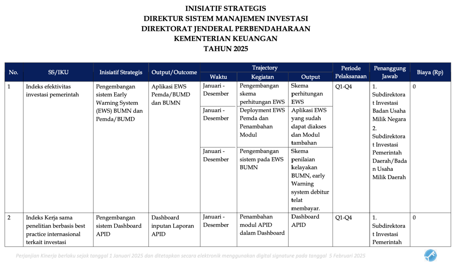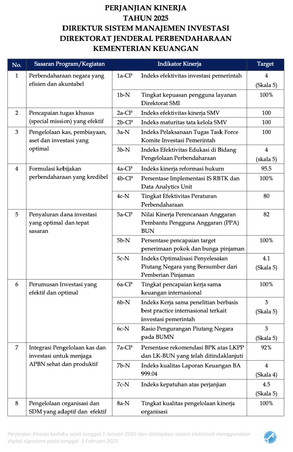 Direktorat Sistem Manajemen Investasi selaku salah satu unit eselon II pada Direktorat Jenderal Perbendaharaan Kementerian Keuangan telah menandatangani Perjanjian Kinerja antara Direktur Sistem Manajemen Investasi dengan Direktur Jenderal Perbendaharaan.