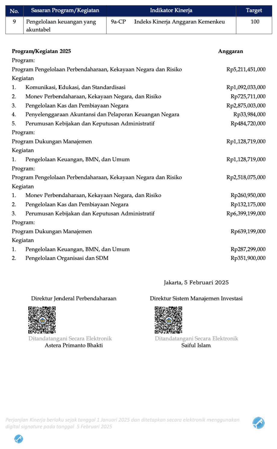 Berdasarkan KMK 300 Tahun 2022 tentang Manajemen Kinerja di Lingkungan Kementerian Keuangan, Perjanjian Kinerja merupakan dokumen kesepakatan antara Pimpinan UPK dengan Pimpinan UPK di atasnya. Perjanjian kinerja berisikan penugasan dari pimpinan instansi yang lebih tinggi kepada pimpinan instansi yang lebih rendah untuk melaksanakan program/kegiatan yang disertai dengan indikator kinerja.