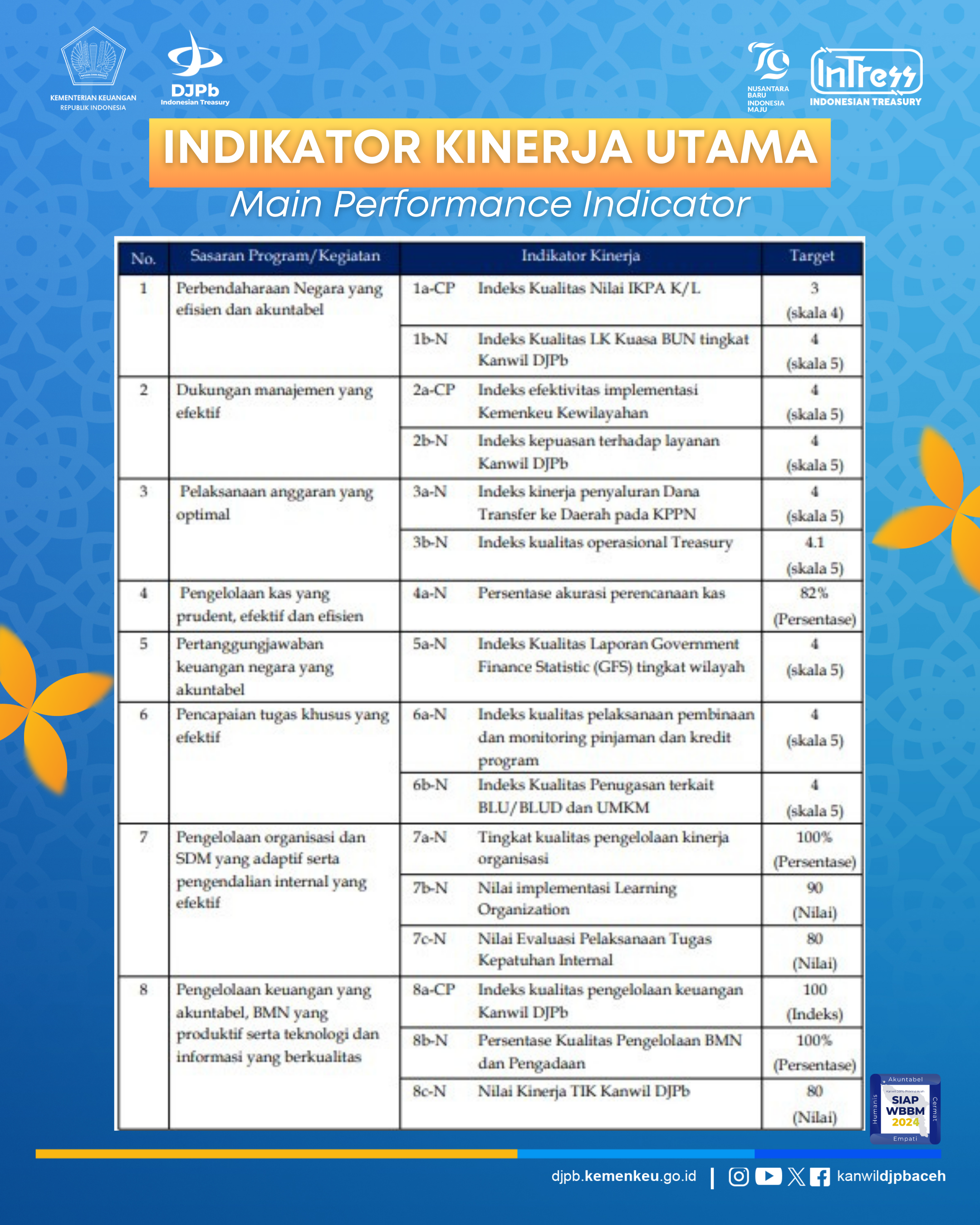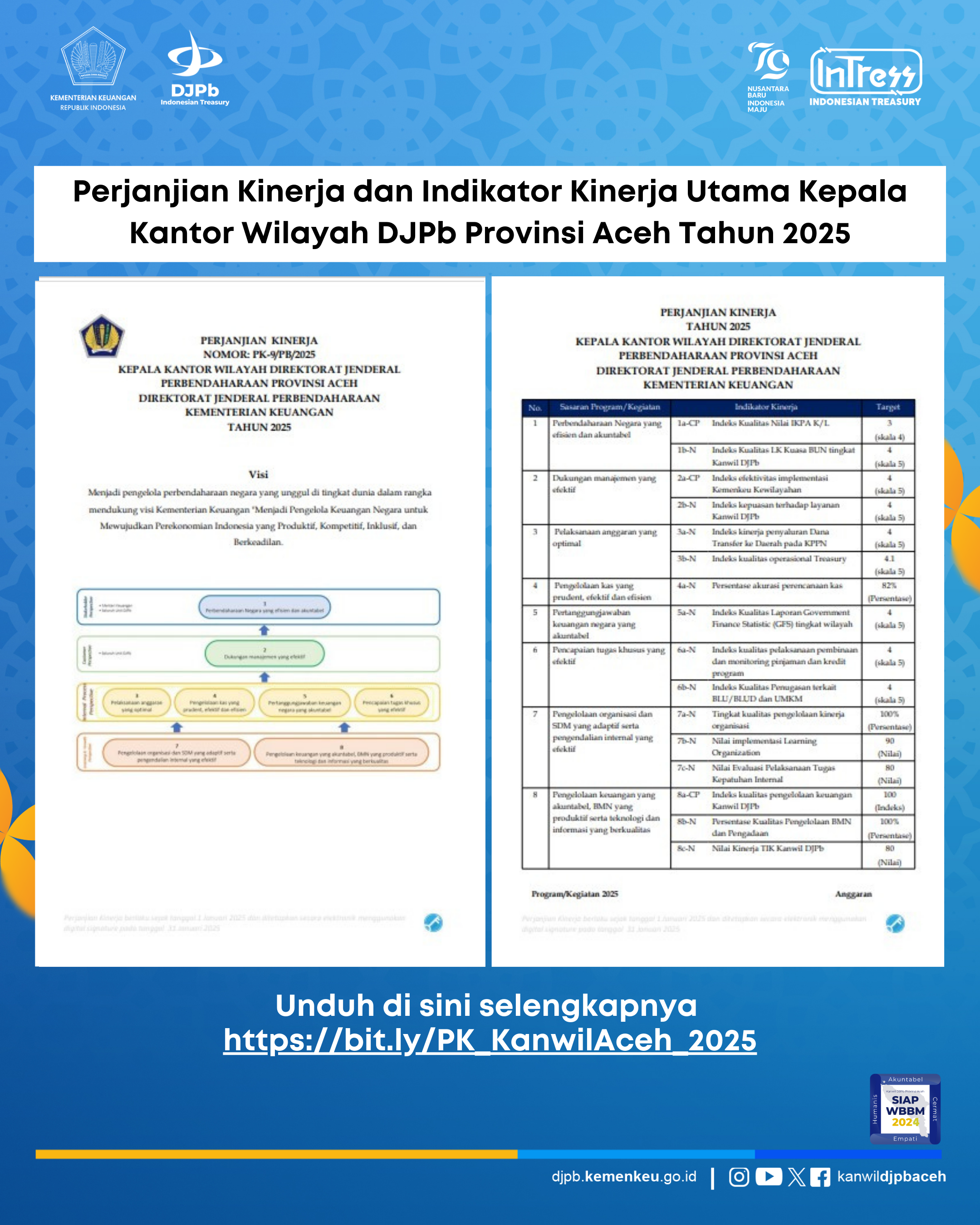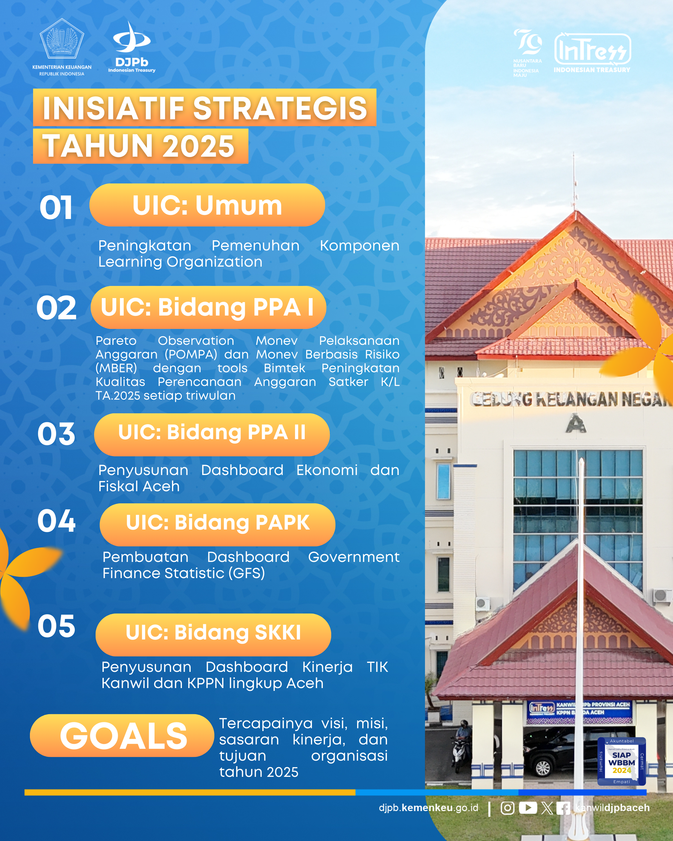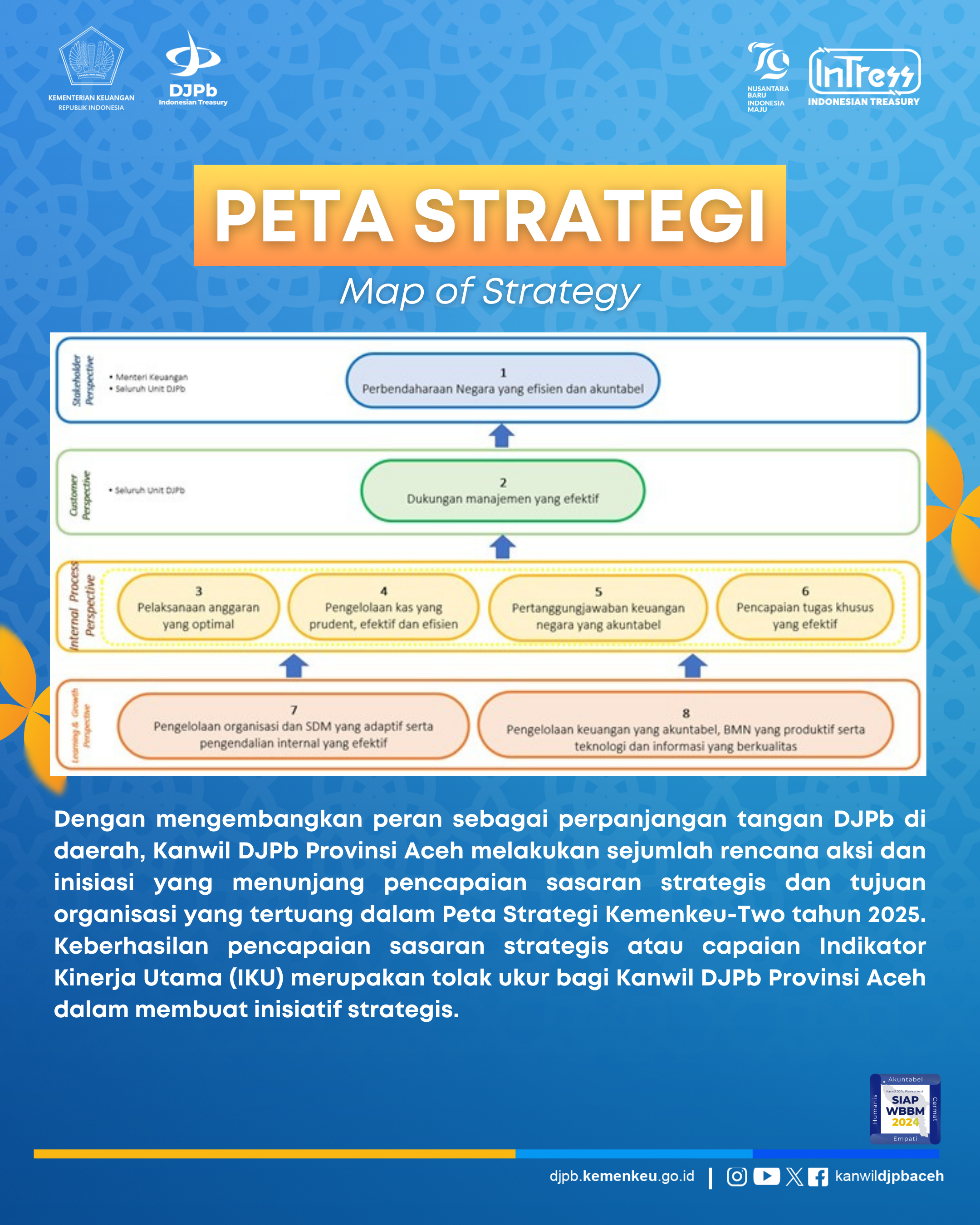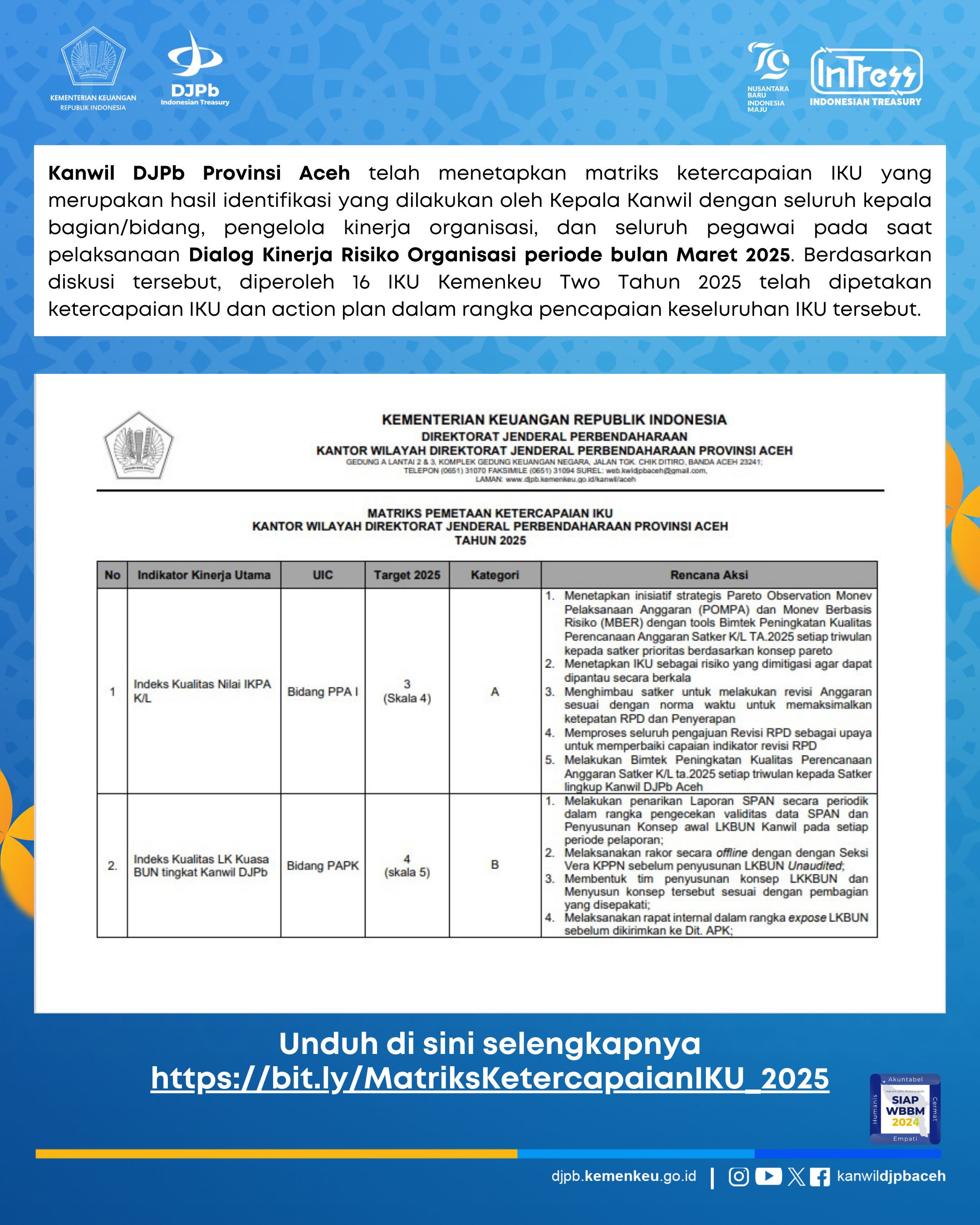 Dengan mengembangkan peran sebagai perpanjangan tangan DJPb di daerah, Kanwil DJPb Provinsi Aceh melakukan sejumlah rencana aksi dan inisiasi yang menunjang pencapaian sasaran strategis dan tujuan organisasi yang tertuang dalam Peta Strategi Kemenkeu-Two tahun 2025. Keberhasilan pencapaian sasaran strategis atau capaian Indikator Kinerja Utama (IKU) merupakan tolak ukur bagi Kanwil DJPb Provinsi Aceh dalam membuat inisiatif strategis.Kanwil DJPb Provinsi Aceh telah menetapkan matriks ketercapaian IKU yang merupakan hasil identifikasi yang dilakukan oleh Kepala Kanwil dengan seluruh kepala bagian/bidang, pengelola kinerja organisasi, dan seluruh pegawai pada saat pelaksanaan Dialog Kinerja Risiko Organisasi periode bulan Maret 2025. Berdasarkan diskusi tersebut, diperoleh 16 IKU Kemenkeu Two Tahun 2025 telah dipetakan ketercapaian IKU dan action plan dalam rangka pencapaian keseluruhan IKU tersebut.