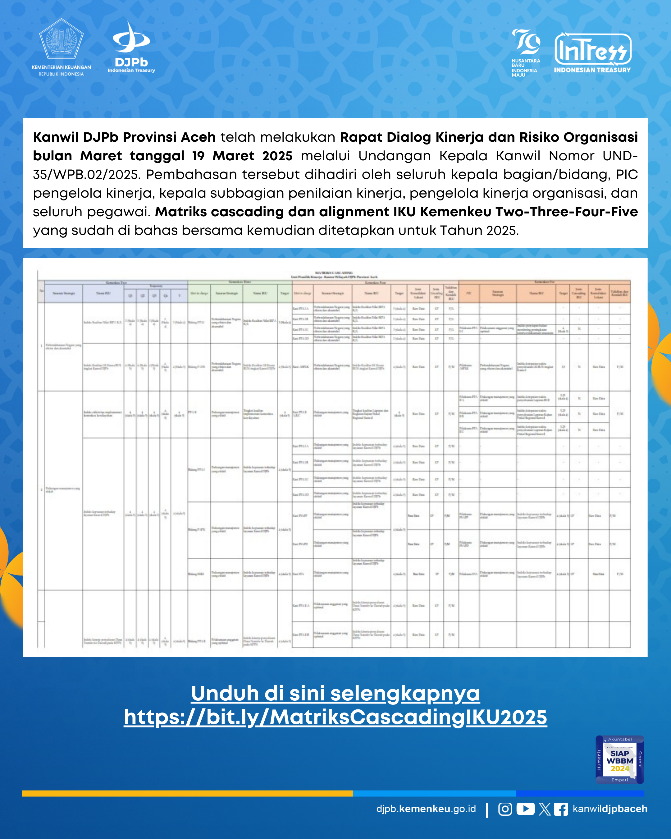 Kanwil DJPb Provinsi Aceh telah melakukan Rapat Dialog Kinerja dan Risiko Organisasi bulan Maret tanggal 19 Maret 2025 melalui Undangan Kepala Kanwil Nomor UND-35/WPB.02/2025. Pembahasan tersebut dihadiri oleh seluruh kepala bagian/bidang, PIC pengelola kinerja, kepala subbagian penilaian kinerja, pengelola kinerja organisasi, dan seluruh pegawai. Matriks cascading dan alignment IKU Kemenkeu Two-Three-Four-Five yang sudah di bahas bersama kemudian ditetapkan untuk Tahun 2025.