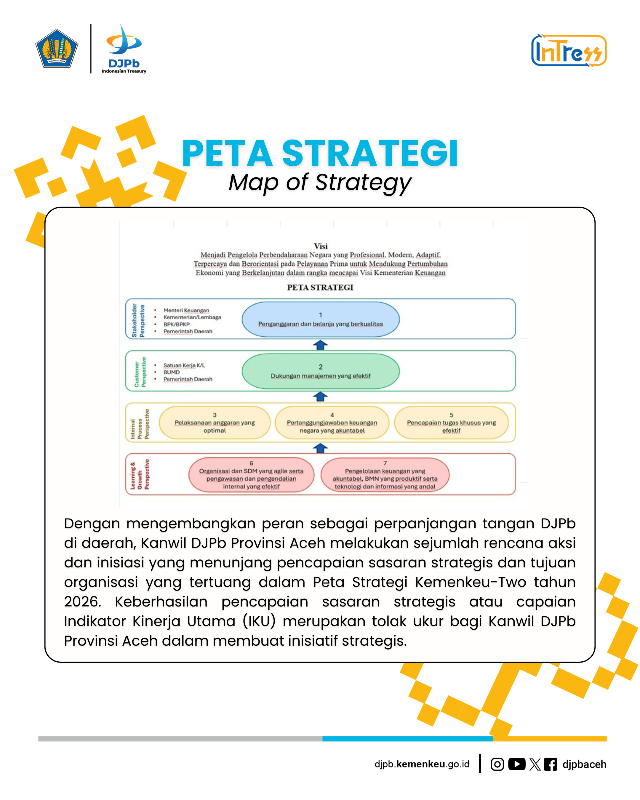 Kanwil Direktorat Jenderal Perbendaharaan (DJPb) Provinsi Aceh terus memperkuat perannya sebagai perpanjangan tangan pusat di daerah melalui berbagai rencana aksi dan inisiatif strategis. Langkah ini dilakukan untuk mendukung pencapaian sasaran strategis organisasi sebagaimana tertuang dalam Peta Strategi Kemenkeu-Two Tahun 2026.