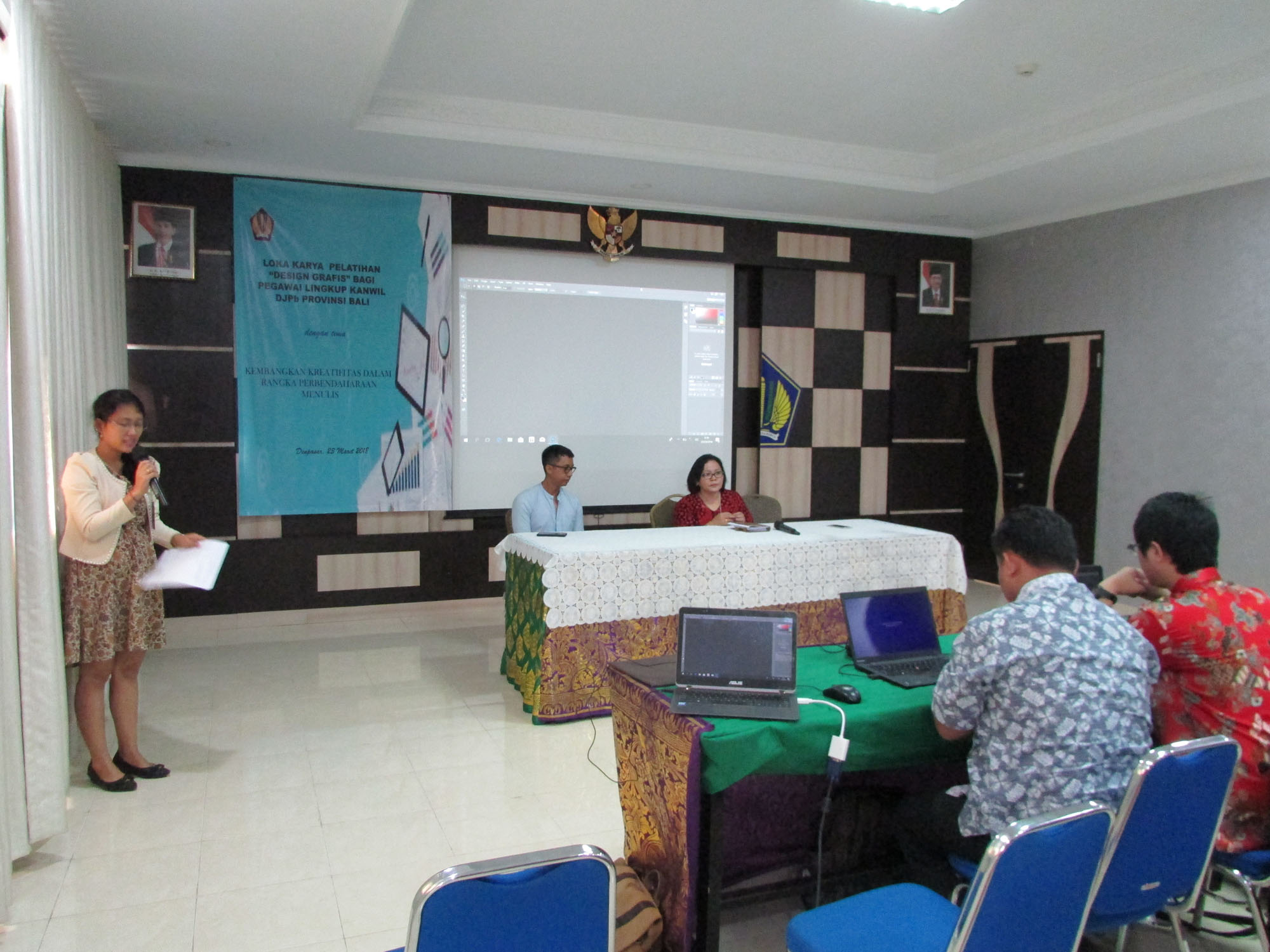 Loka Karya Teknis Penulisan dan Desain Grafis Bagi Pegawai Lingkup Kanwil Ditjen Perbendaharaan Provinsi Bali dilaksanakan secara bertahap tanggal 23 Maret 2018 dan 29 Maret 2018 .