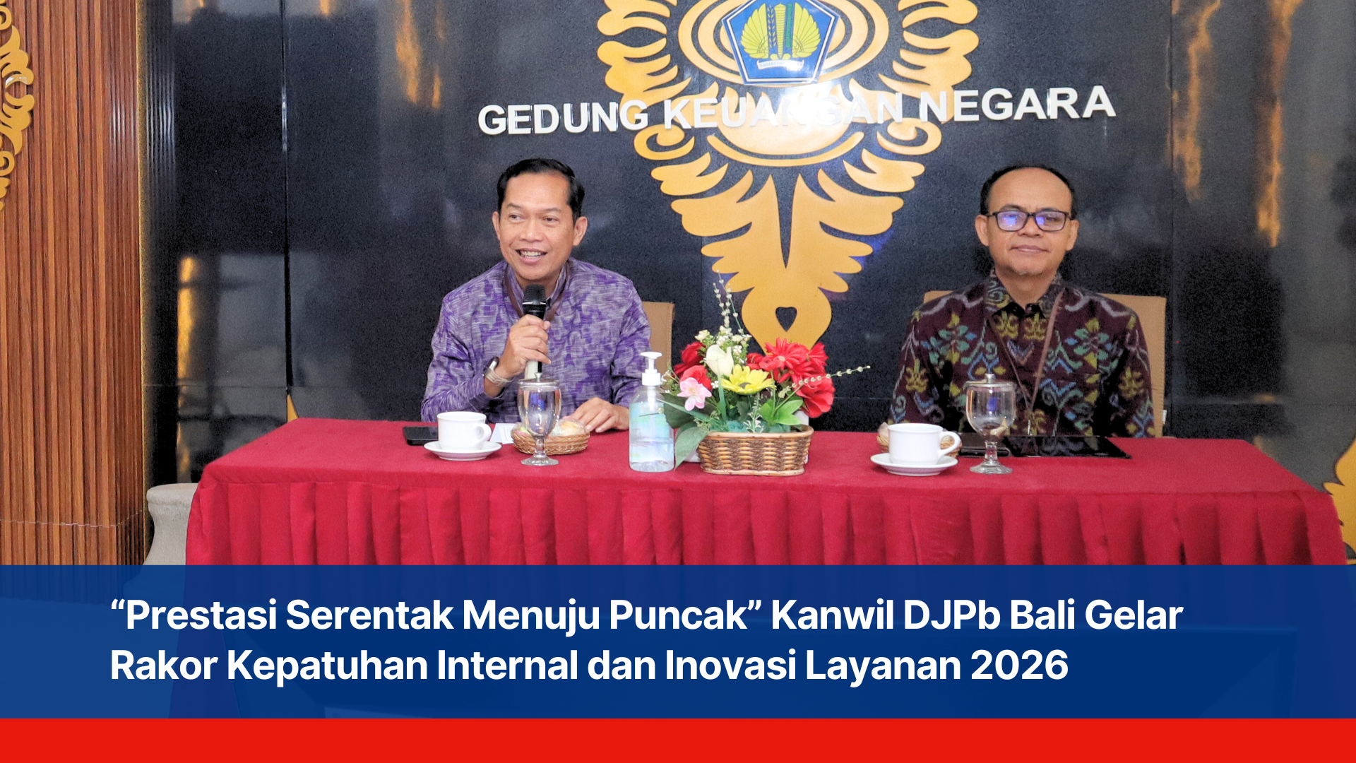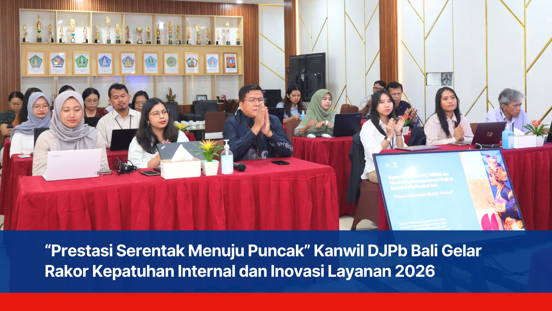 Denpasar, 27 Januari 2026 – Dalam rangka meningkatkan pemahaman dan menyamakan persepsi dalam pelaksanaan tugas kepatuhan internal, Kanwil DJPb Provinsi Bali menyelenggarakan Rapat Koordinasi Unit Kepatuhan Internal, WBBM, serta Rapat Koordinasi Inovasi Layanan Lingkup Kanwil Ditjen Perbendaharaan Provinsi Bali Tahun 2026 pada 27–28 Januari 2026 di Aula Kanwil DJPb Provinsi Bali, mengusung tagline “Prestasi Serentak Menuju Puncak”.