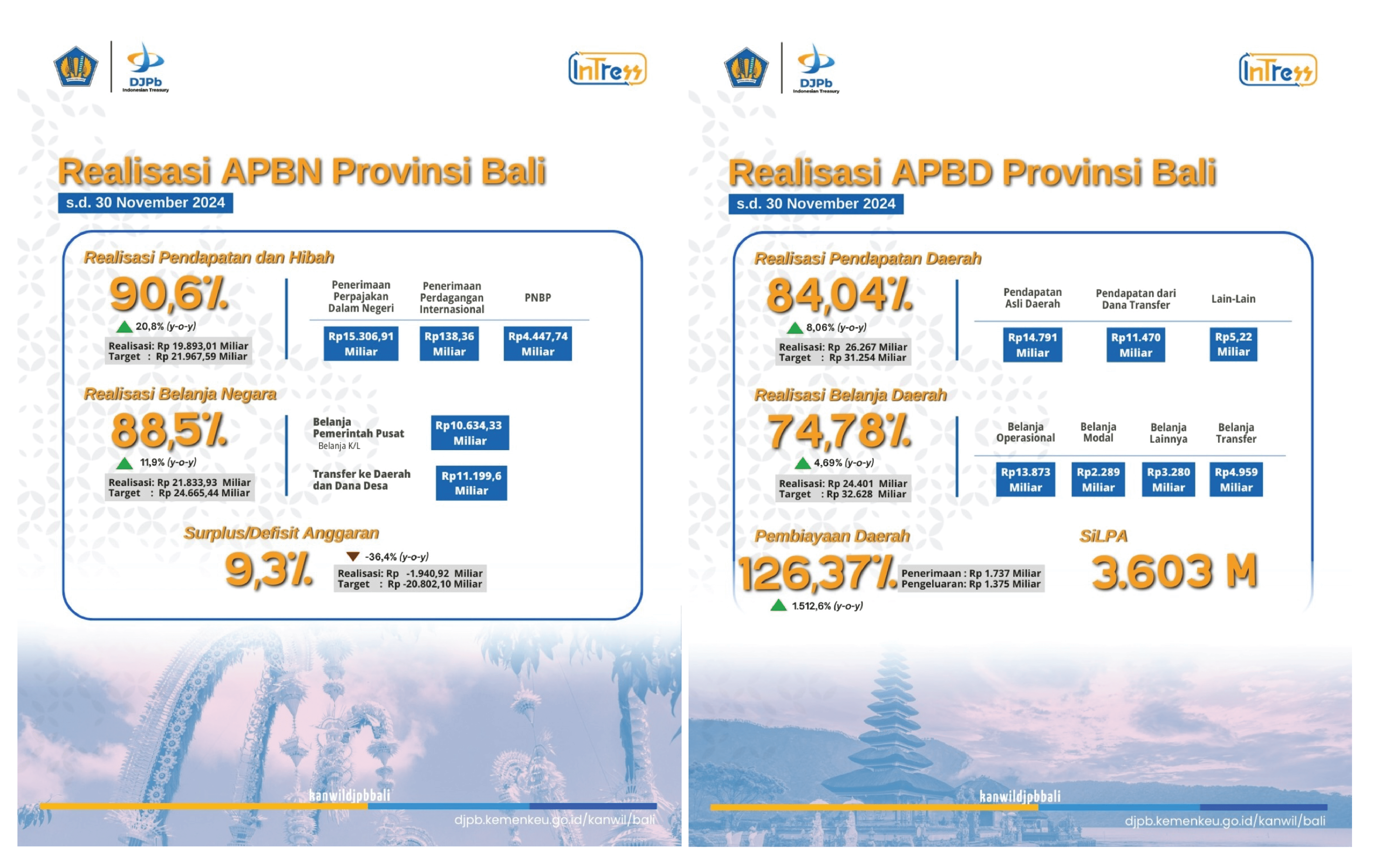 Secara lebih rinci, realisasi pendapatan negara di Bali hingga 30 Juni 2025 tercatat sebesar Rp10,42 triliun atau 44,62% dari pagu, meningkat 7,75% secara tahunan (year-on-year). Sementara itu, realisasi belanja negara mencapai Rp10,09 triliun atau 45,14% dari pagu, meski mengalami kontraksi sebesar 12,67% (yoy) yang disebabkan oleh efisiensi belanja. Secara keseluruhan, APBN di Provinsi Bali mengalami surplus sebesar Rp322,12 miliar. Realisasi Transfer ke Daerah dan Dana Desa (TKDD) sebesar Rp6,05 triliun atau 50,03% dari pagu, sedikit menurun sebesar 2,45% (yoy).