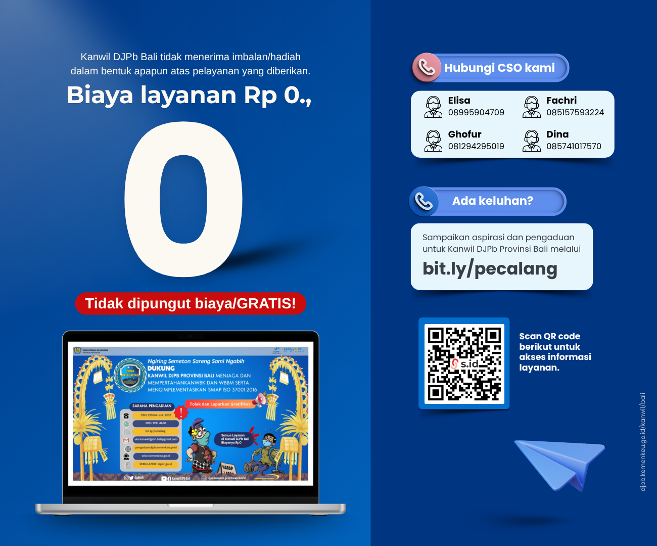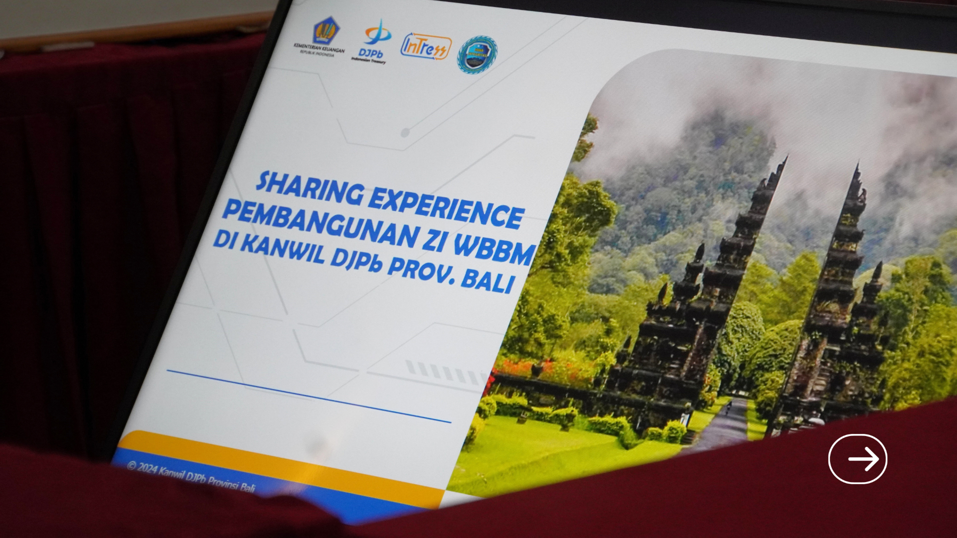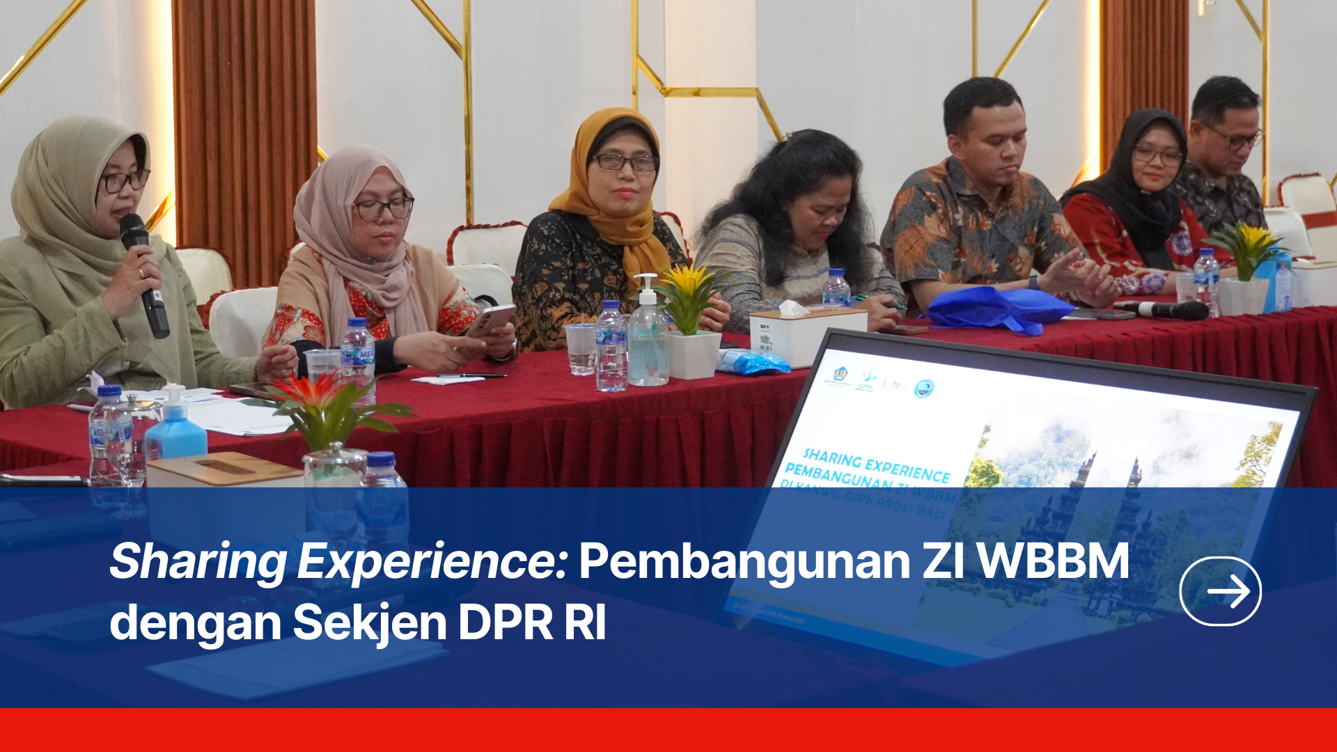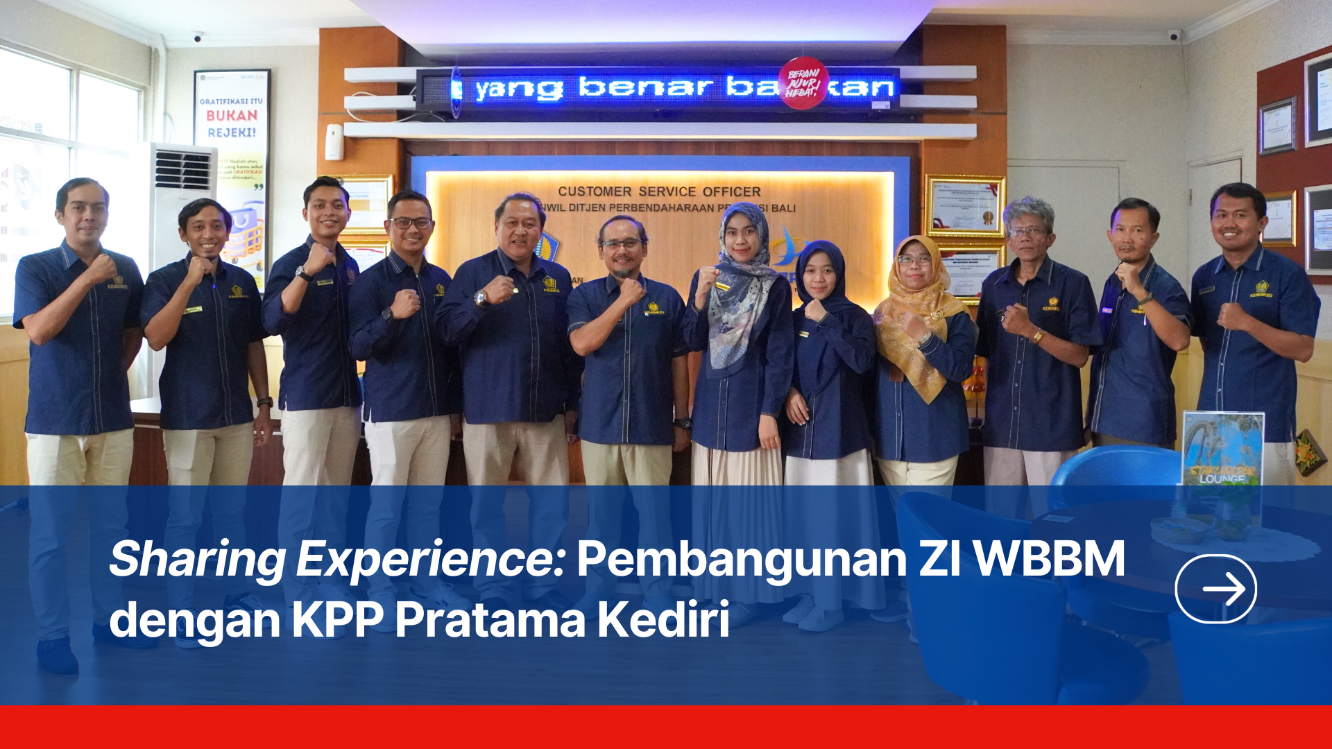 Dalam rangka mendukung keberlanjutan pelaksanaan reformasi birokrasi melalui pembangunan Zona Integritas menuju Wilayah Bebas dari Korupsi (WBK) dan Wilayah Birokrasi Bersih dan Melayani (WBBM), Kanwil DJPb Provinsi Bali senantiasa berkomitmen meningkatkan kualitas penyelenggaraan pemerintahan yang bersih, akuntabel, dan berorientasi pada pelayanan publik yang prima. Sebagai bentuk komitmen tersebut, Kanwil DJPb Provinsi Bali selalu siap berbagi pengalaman dan praktik baik kepada berbagai instansi pemerintah, baik di tingkat pusat maupun daerah, yang ingin memperoleh informasi maupun pembelajaran terkait strategi dan kiat-kiat pembangunan Zona Integritas menuju WBK dan WBBM.