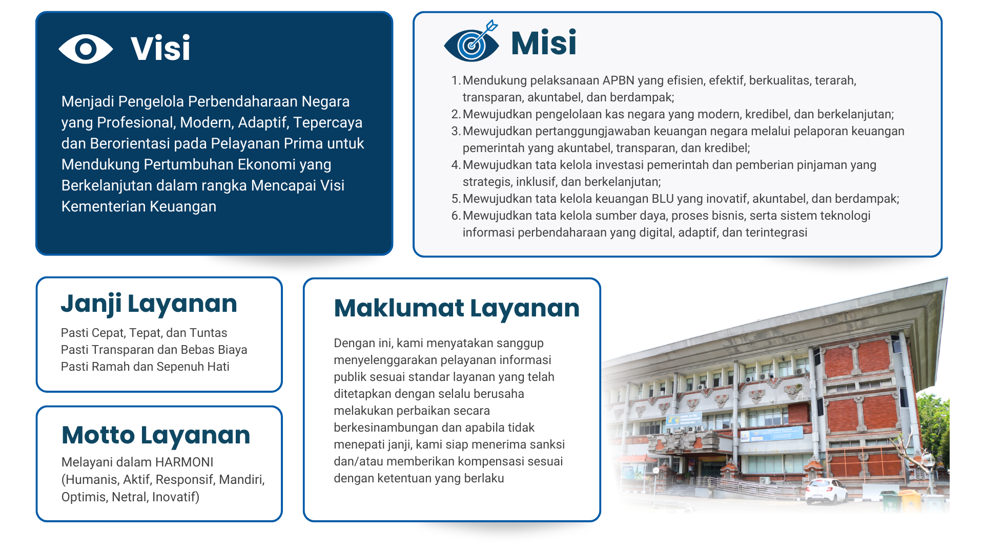 PELAYANANMemberikan layanan yang memenuhi kepuasan pemangku kepentingan yang dilakukan dengan sepenuh hati, transparan, cepat, akurat dan aman. Prilaku Utama ;