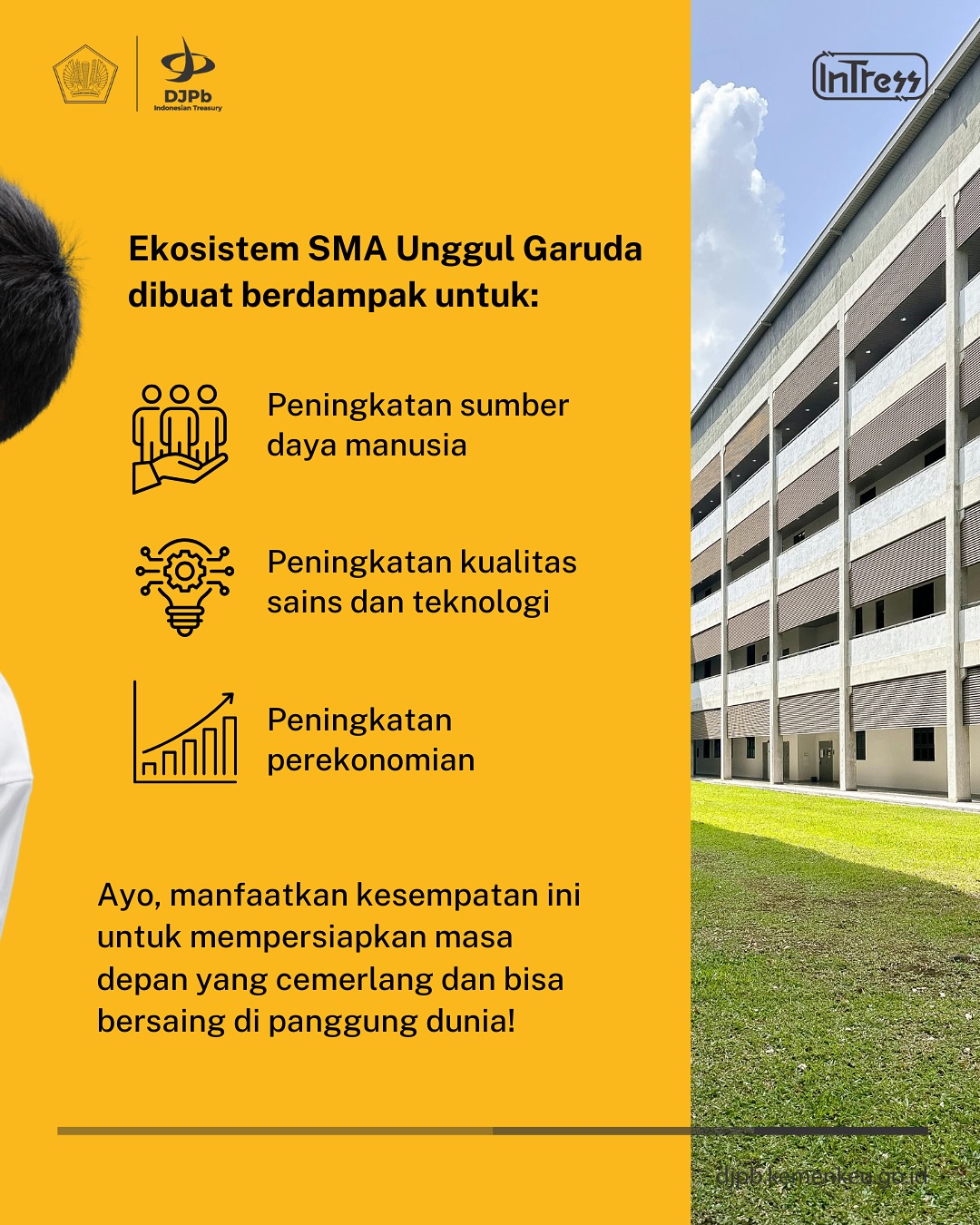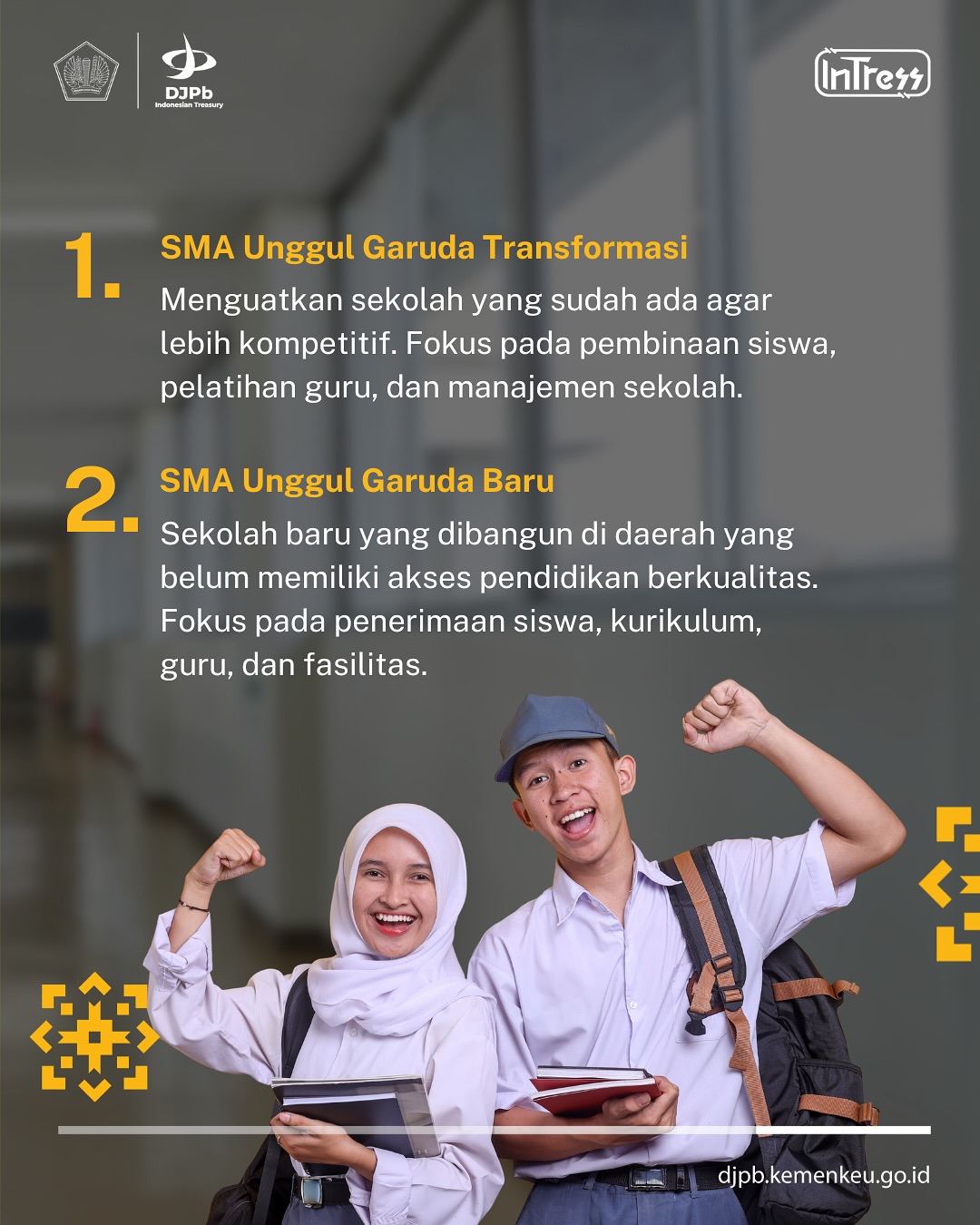 Pendidikan adalah kunci masa depan bangsa. Untuk itu, pemerintah terus berkomitmen menghadirkan akses dan kualitas pendidikan yang merata bagi seluruh anak Indonesia. Sekolah Unggul Garuda hadir untuk memastikan akses pendidikan bermutu di tingkat SMA yang dapat dirasakan secara merata di berbagai daerah di Indonesia. Baik Sekolah Unggul Garuda Transformasi maupun Sekolah Unggul Garuda Baru memiliki tujuan yang sama, yaitu mempersiapkan peserta didik untuk menembus perguruan tinggi di tingkat dunia.