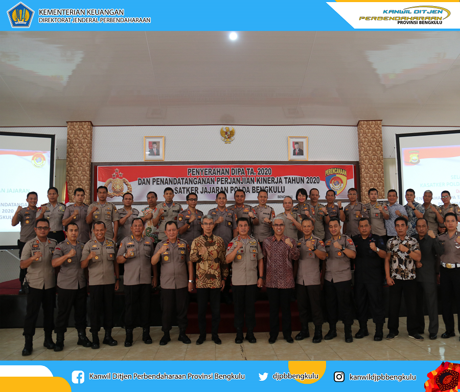 Jumat, 6 Desember 2019, bertempat di Aula Polda Bengkulu acara Penyerahan DIPA Tahun Anggaran 2020 dan Penandatanganan Perjanjian Kinerja Tahun 2020 Satuan Kerja Jajaran Polda Bengkulu diselenggarakan dengan dihadiri oleh para perwakilan Kepala Satuan Kerja (Kasatker) dan Kepala Kepolisian Resor (Kapolres) serta Kepala Kanwil DJPb Provinsi Bengkulu.