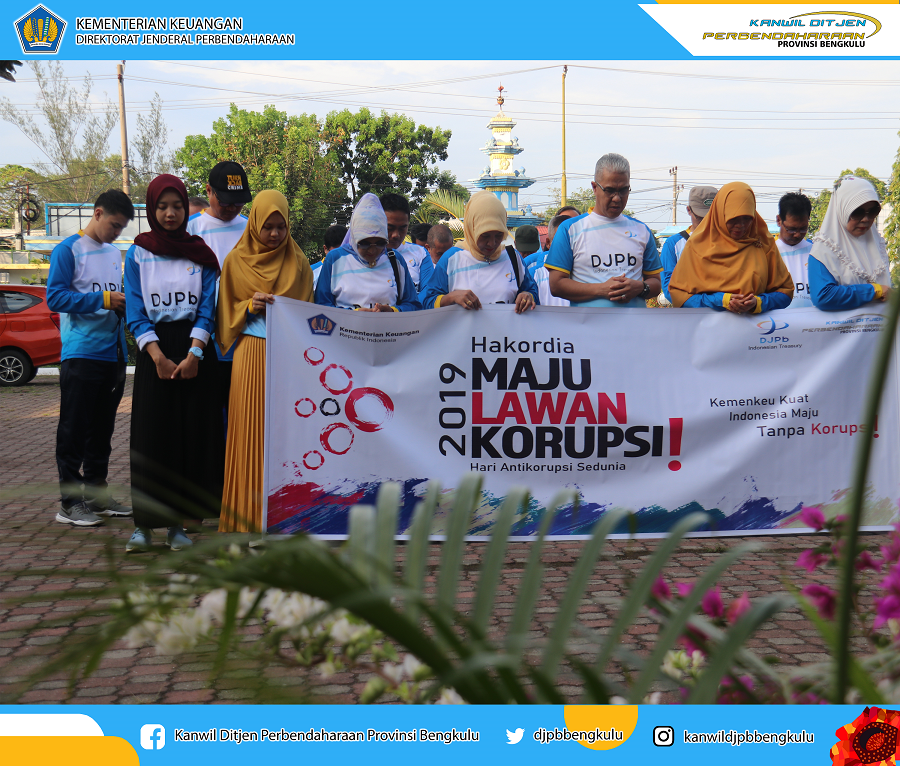 Jumat, 13 Desember 2019, Kanwil DJPb Provinsi Bengkulu melaksanakan Kegiatan Peringatan Hari Antikorupsi Sedunia yang jatuh pada tanggal 9 Desember. Hakordia 2019 mengangkat tema "Maju Lawan Korupsi".