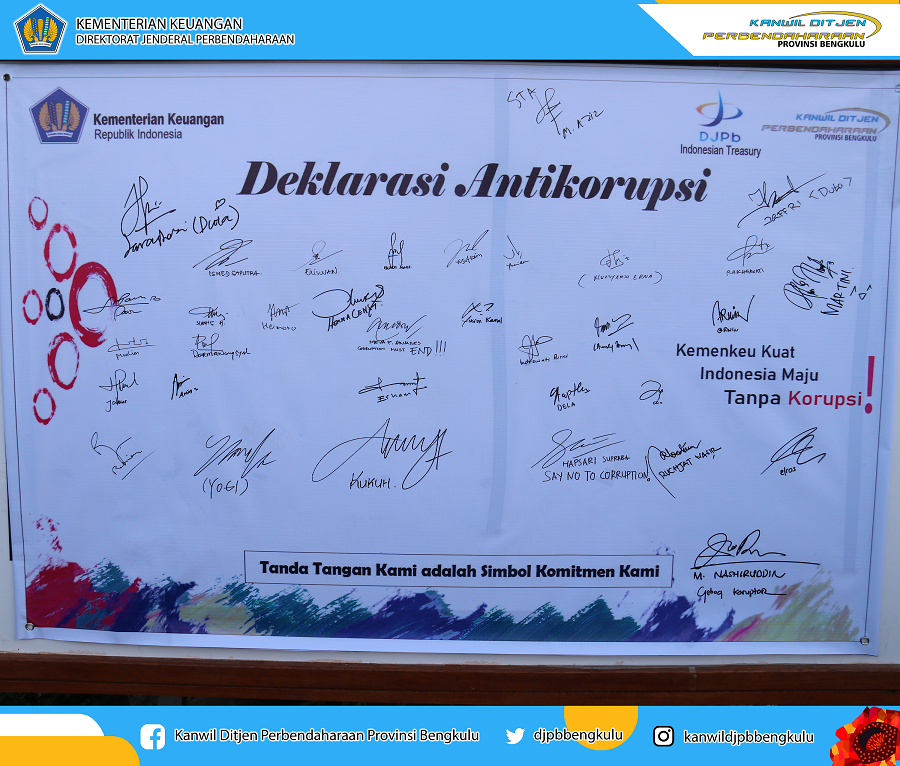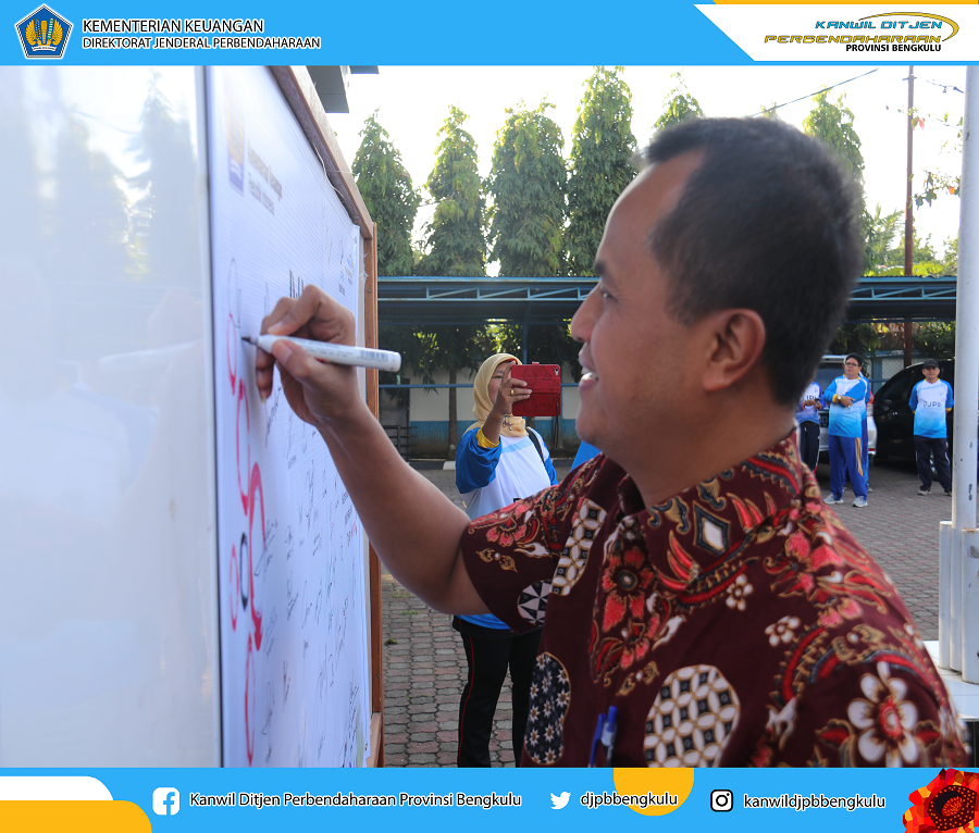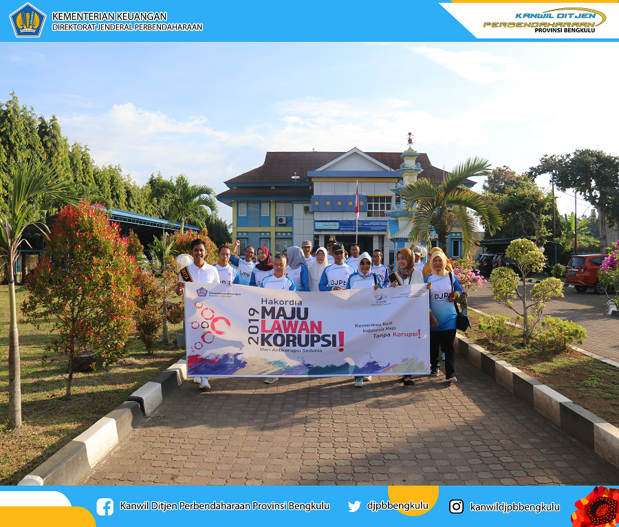 Kegiatan diawali dengan sambutan dan pengarahan dari Kepala Kanwil DJPb Provinsi Bengkulu, Ismed Saputra. Setelah itu dilanjutkan dengan penandatanganan Deklarasi Antikorupsi oleh seluruh pegawai dan juga Direktur Sistem Perbendaharaan, Agung Yulianta beserta tim dari Subdit Standardisasi dan Pengembangan Kompetensi Pengelola Perbendaharaan, Direktorat Sistem Perbendaharaan. Deklarasi Antikorupsi melalui tanda tangan adalah simbol komitmen dari para pegawai untuk maju bersama melawan korupsi. Setelah itu, para pegawai melakukan jalan santai sekaligus melakukan public campaign gerakan Antikorupsi melalui pembagian stiker Antikorupsi kepada masyarakat. Hakordia 2019, Kemenkeu Kuat, Indonesia Maju, Tanpa Korupsi !