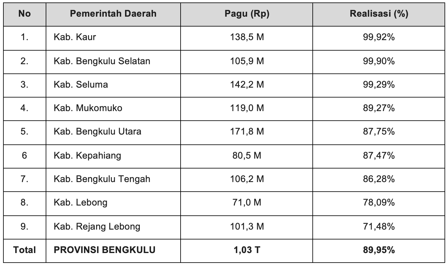 - Kabupaten Kaur: Menjadi juara realisasi dengan capaian 99,92%. Hampir seluruh pagu Rp138,5 miliar telah tersalurkan.