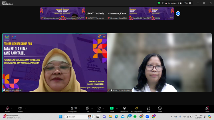 Yogyakarta, 25 Juli 2024 - Kanwil Ditjen Perbendaharaan (DJPb) Provinsi Daerah Istimewa Yogyakarta (DIY) menyelenggarakan Forum Diskusi Kamis Pon dengan tema “Tata Kelola Hibah yang Akuntabel untuk Mendukung Pelaksanaan Anggaran yang Berkualitas dan Menyejahterakan” pada Kamis (25/7/2024). Acara yang digelar secara daring itu diikuti satuan kerja (satker) lingkup DIY.