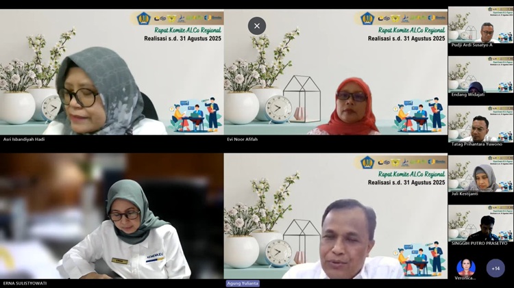 Yogyakarta, 22 September 2025 - Kantor Wilayah Direktorat Jenderal Perbendaharaan Provinsi Daerah Istimewa Yogyakarta (Kanwil DJPb DIY) menggelar Rapat Asset Liability Committee (ALCo) Regional secara daring dengan agenda pembahasan realisasi hingga 31 Agustus 2025. Rapat rutin bulanan ini diikuti oleh seluruh unsur Kementerian Keuangan Satu di wilayah DIY pada 22 September 2025.