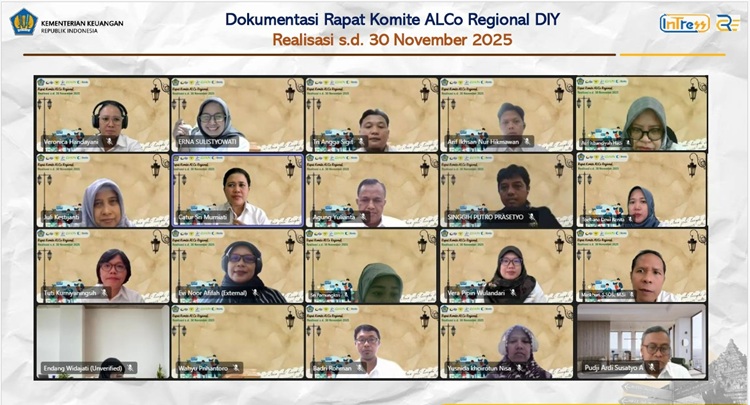 Yogyakarta, 22 Desember 2025 - Kantor Wilayah Direktorat Jenderal Perbendaharaan Provinsi Daerah Istimewa Yogyakarta (Kanwil DJPb DIY) menyelenggarakan Rapat Asset Liability Committee (ALCo) Regional secara daring pada Senin (22/12/2025). Agenda utama rapat ini membahas perkembangan perekonomian daerah serta realisasi fiskal hingga 30 November 2025.