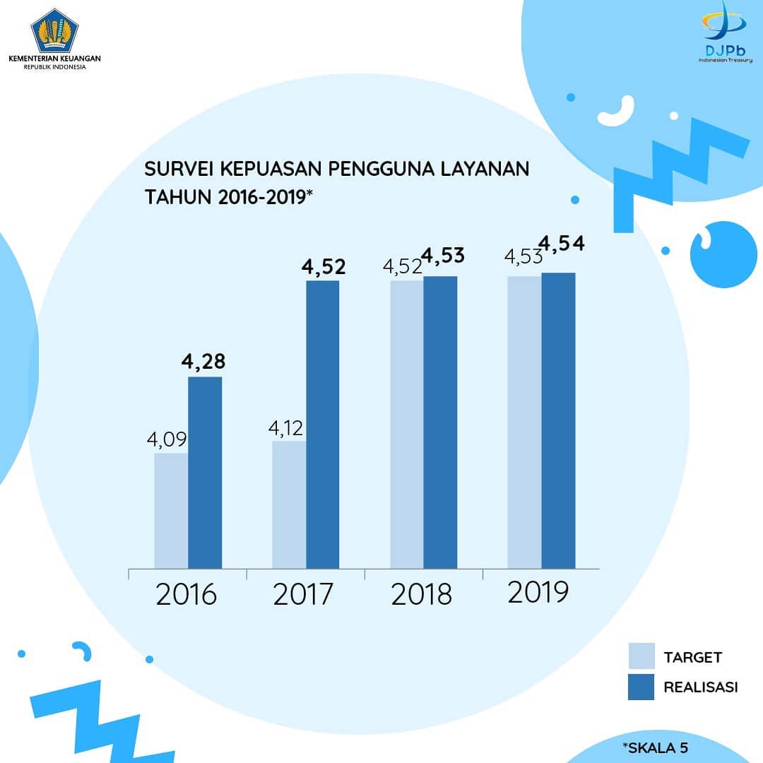 Indeks Kepuasan Satker terhadap layanan Kanwil menjadi salah satu tolok ukur kinerja layanan yang diberikan oleh Kanwil Ditjen Perbendaharaan Provinsi D.I. Yogyakarta. Survei dilaksanakan atas kinerja layanan revisi DIPA serta sarana dan prasarana dalam mendukung kinerja layanan. Hasil survei selama periode 2016-2019 menunjukkan tingkat kepuasan satker rata-rata 4,47 (skala 5) dan capaiannya terus meningkat setiap tahun. Terima kasih atas kepercayaan dari seluruh Satker, Kanwil Ditjen Perbendaharaan Provinsi D.I. Yogyakarta berkomitmen untuk terus memberikan layanan terbaik dan tanpa biaya.