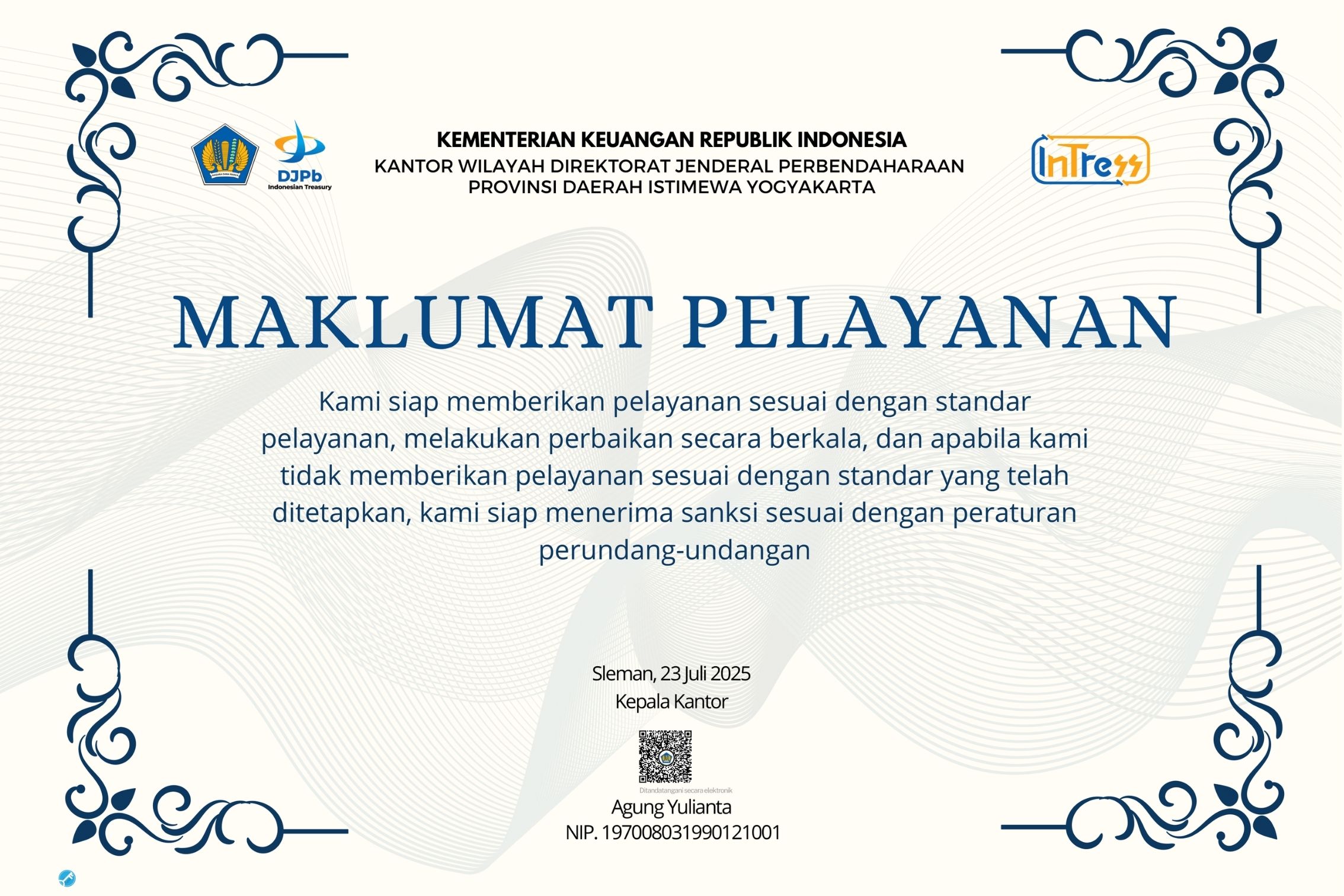 - Maklumat pelayanan yang dimiliki Kanwil Ditjen Perbendaharaan Provinsi D.I. Yogyakarta mencerminkan komitmen kesungguhan pimpinan dan segenap pegawai dalam memberikan pelayanan kepada pengguna layanan sesuai norma waktu yang ditetapkan dalam rangka pelayanan yang berkualitas, akurat, bermanfaat, dan tanpa biaya.