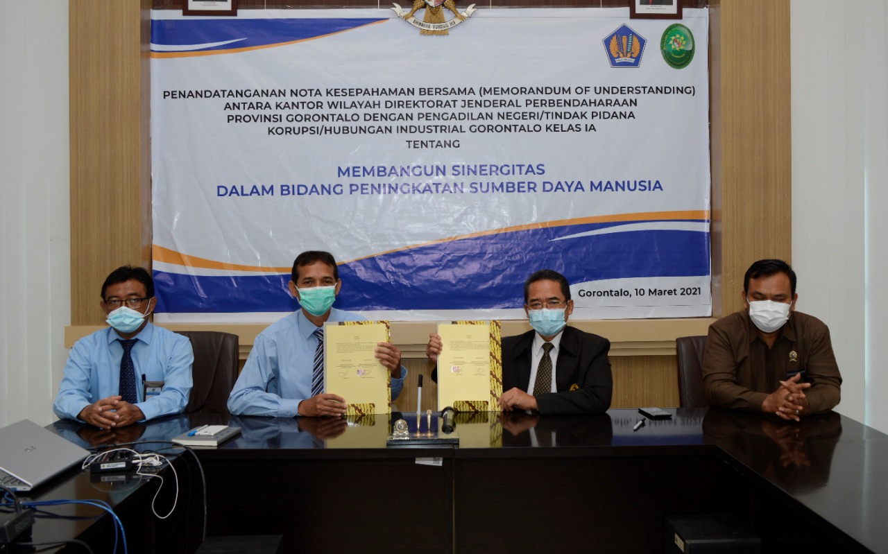 Kanwil Ditjen Perbendaharaan Provinsi Gorontalo menyelenggarakan Penandatanganan Nota Kesepahaman Bersama (Memorandum of Understanding) antara Kantor Wilayah Direktorat Jenderal Perbendaharaan Provinsi Gorontalo dengan Pengadilan Negeri/Tindak Pidana Korupsi/Hubungan Industrial Gorontalo Kelas IA. Kegiatan ini dihadiri oleh Kepala Kanwil DJPb Provinsi Gorontalo Bapak Sugiyarto, S.E., Ak., M.Sc., Ph.D., Kepala Pengadilan Negeri/Tindak Pidana Korupsi/Hubungan Industrial Gorontalo Kelas IA Bapak Prayitno serta Pejabat Administrator Lingkup Kanwil Ditjen Perbendaharaan Gorontalo. MoU ini sebagai wujud komitmen bersama dalam pengembangan dan penguatan kapasitas Sumber Daya Manusia. (Gorontalo,10/03)