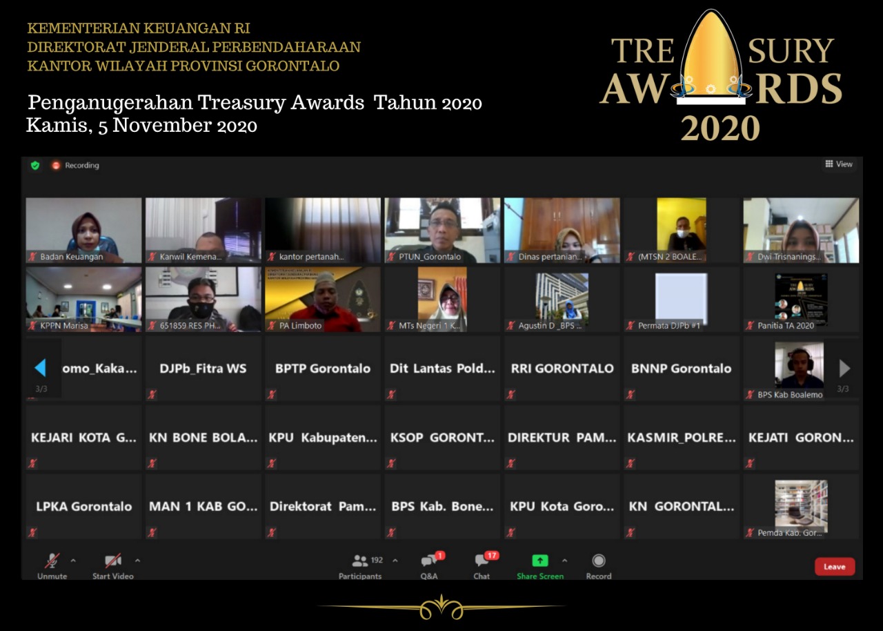 Hari Kamis tanggal 5 November 2020 telah diselenggarakan kegiatan Penganugerahan Treasury Awards Kanwil Ditjen Perbendaharaan Provinsi Gorontalo Tahun 2020.