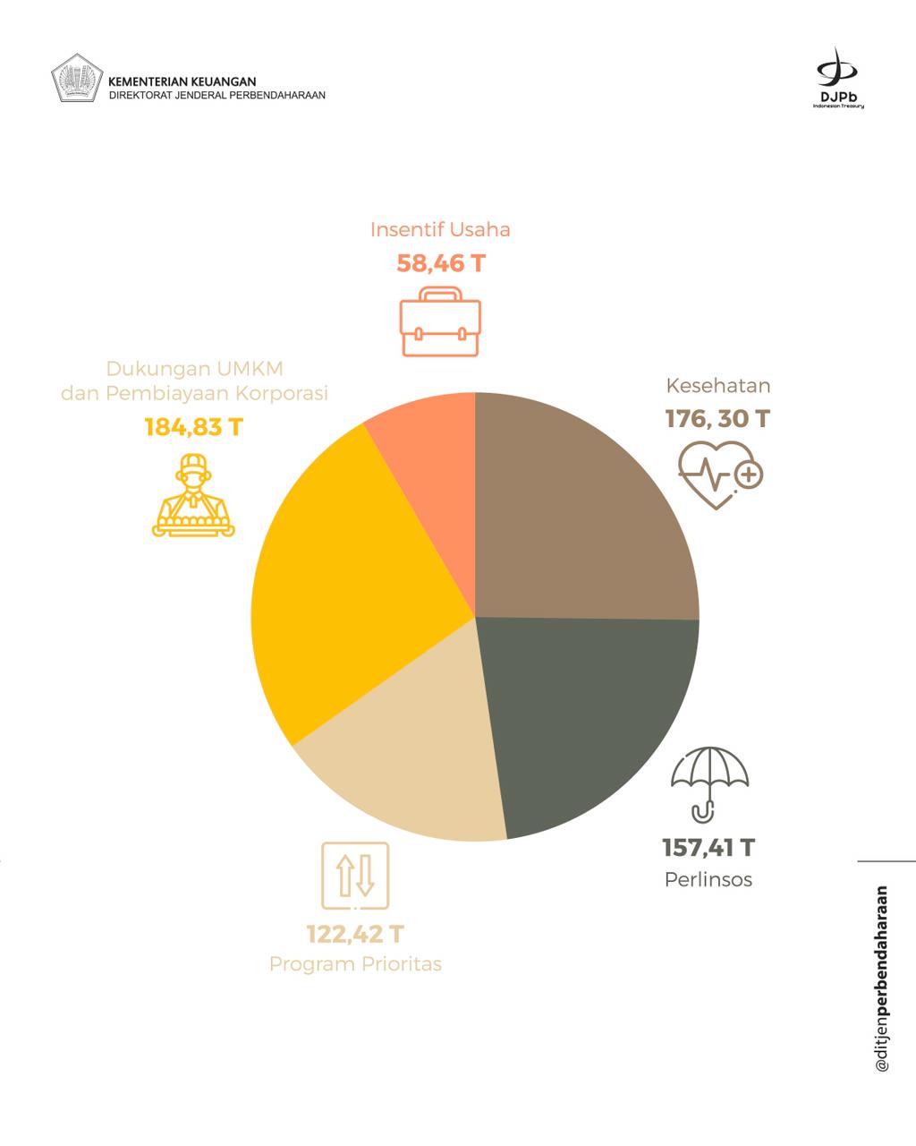Anggaran PC PEN tahun 2021 tersebut terbagi dalam lima cluster, yaitu cluster Kesehatan sebesar Rp176,30 triliun, cluster Perlindungan Sosial sebesar Rp157,41 triliun, cluster Program Prioritas sebesar Rp122,42 triliun, cluster Dukungan UMKM dan Pembiayaan Korporasi sebesar Rp184,83 triliun, serta cluster insentif usaha sebesar Rp58,46 triliun.