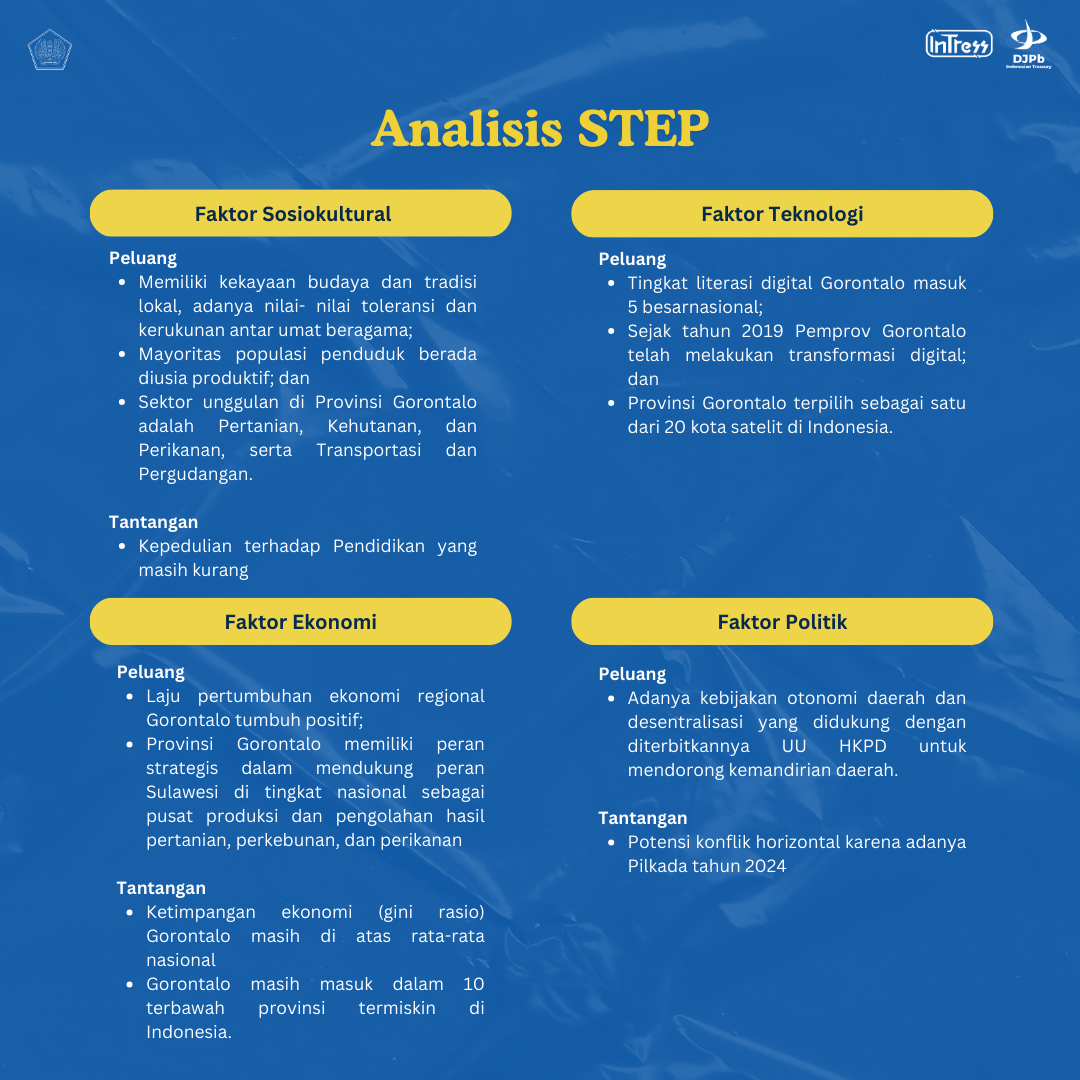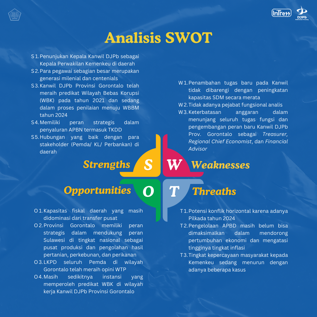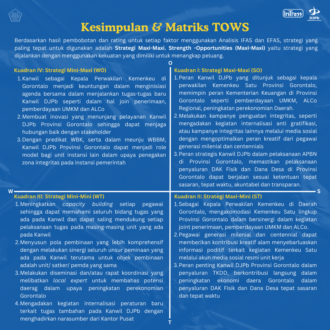 Kanwil DJPb Provinsi Gorontalo telah melakukan analisis atas faktor internal dan eksternal organisasi sehingga dapat diformulasikan strategi organisasi yang paling optimal untuk dilakukan di tahun 2024 dalam rangka mencapai tujuan organisasi. Berdasarkan hasil perhitungan IFAS (Internal Factor Strategic Analysis) dan EFAS (External Factor Strategic Analysis), Kanwil DJPb Provinsi Gorontalo menjalankan strategi Maxi-Maxi yang artinya menggunakan kekuatan (S) untuk menangkap peluang (O) dengan rincian sebagai berikut.
