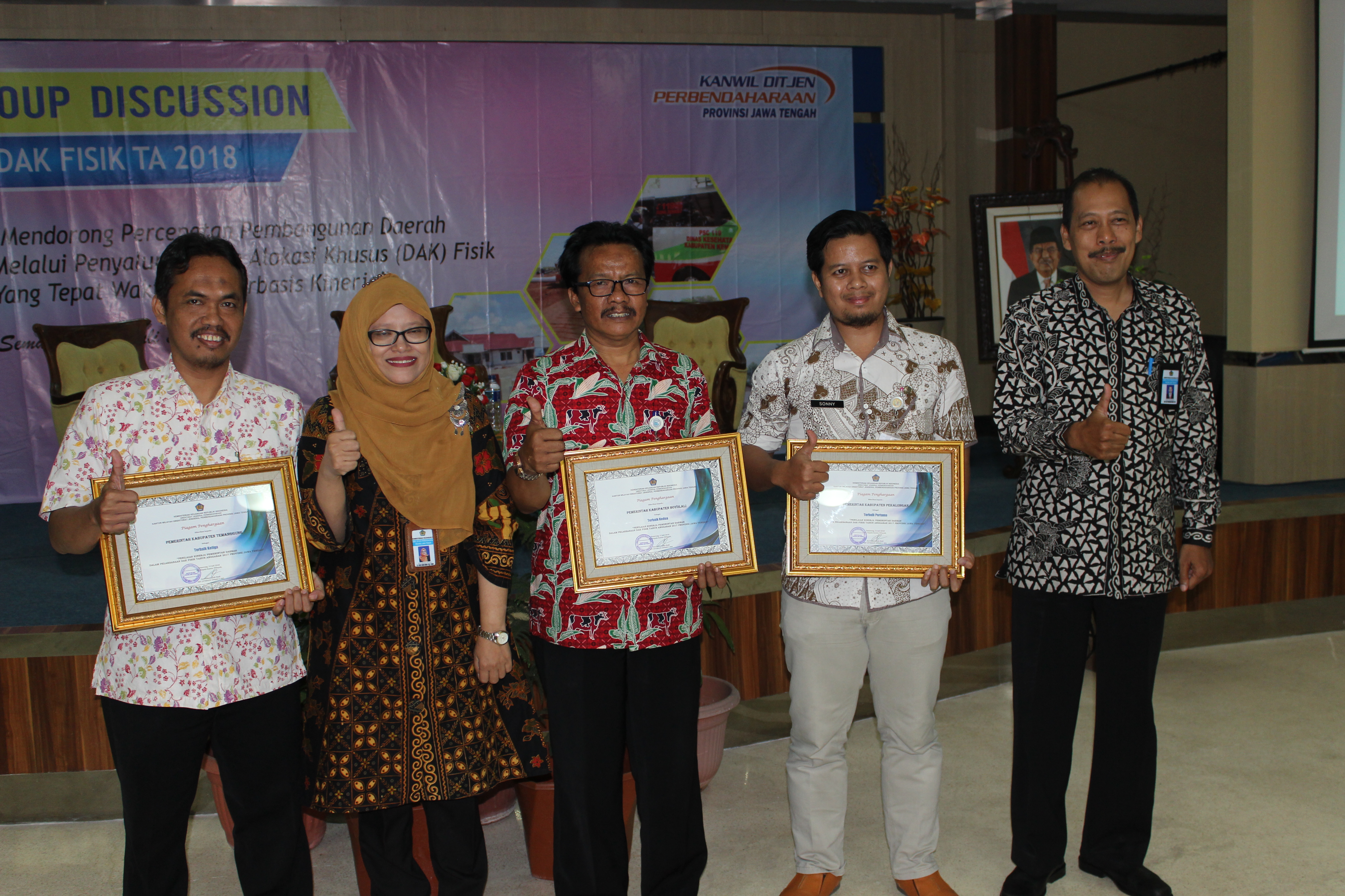 Dalam acara FGD ini disampaikan pula pemberian apresiasi kepada Pemda yang memiliki kinerja 3 (tiga) terbaik dalam penyaluran DAK Fisik TA 2017 yaitu pertama Pemkab Pekalongan, kedua Pemkab Boyolali dan ketiga Pemkab Temanggung. Parameter penilaian didasarkan pada realisasi penyerapan, capaian output dan bidang tidak salur yang memiliki kinerja terbaik sehingga pada akhirnya dapat mendorong Pemda lainnya untuk dapat berkinerja lebih baik.