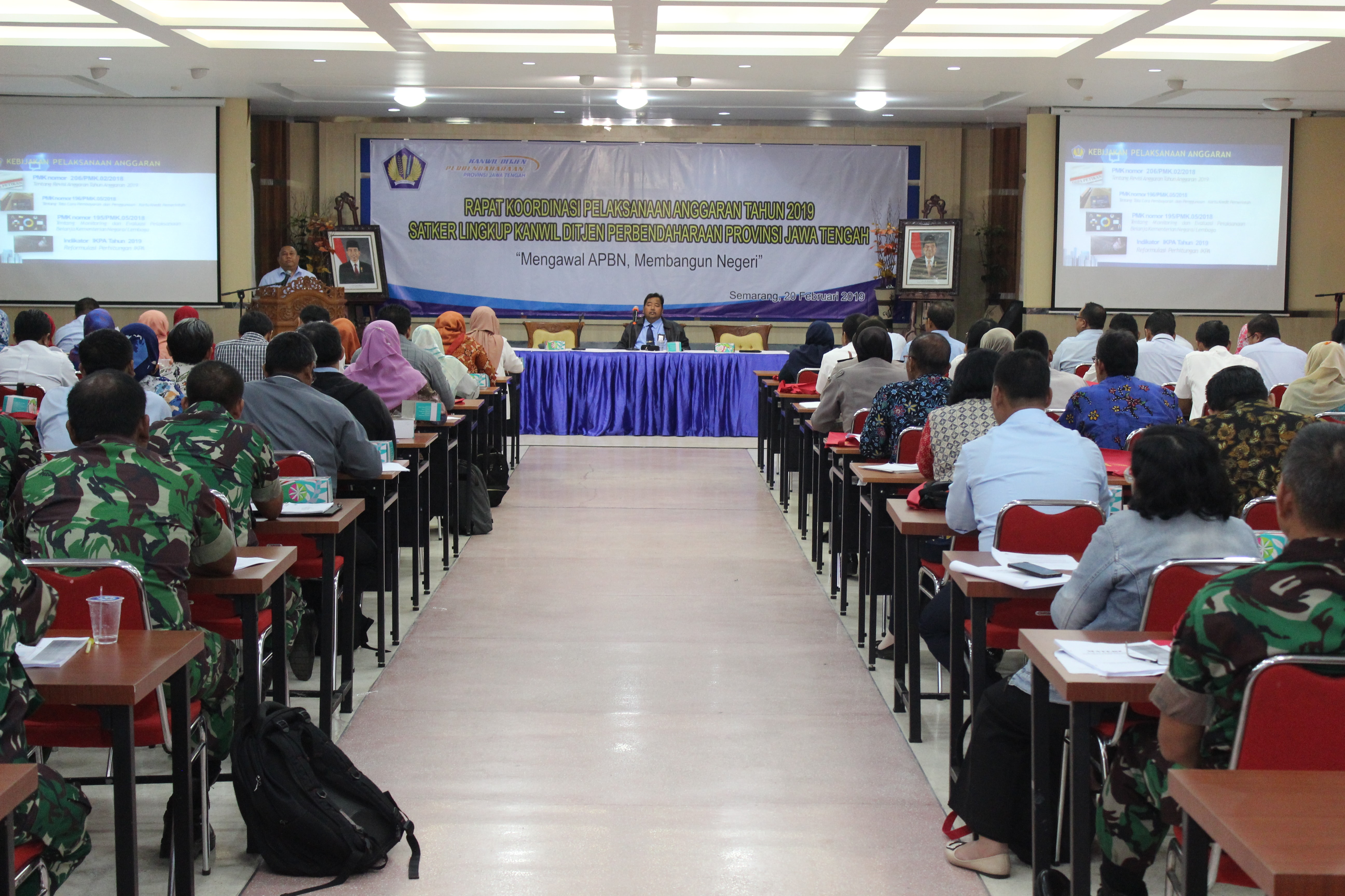 Semarang, Liputan djpb.kemenkeu.go.id/kanwil/jateng/id - Kanwil Ditjen Perbendaharaan Provinsi Jawa Tengah menyelenggarakan Rapat Koordinasi (Rakor) Pelaksanaan Anggaran 2019. Kegiatan yang diikuti oleh Satker mitra kerja dan KPPN lingkup Jawa Tengah ini membahas peraturan-peraturan terbaru dan langkah strategis untuk meningkatkan sinergi dan kinerja pelaksanaan anggaran tahun 2019. Rakor dilaksanakan Rabu, 20 Februari 2019 bertempat di Aula GKN Semarang I lantai 4, Jalan Pemuda Nomor 2, Semarang.