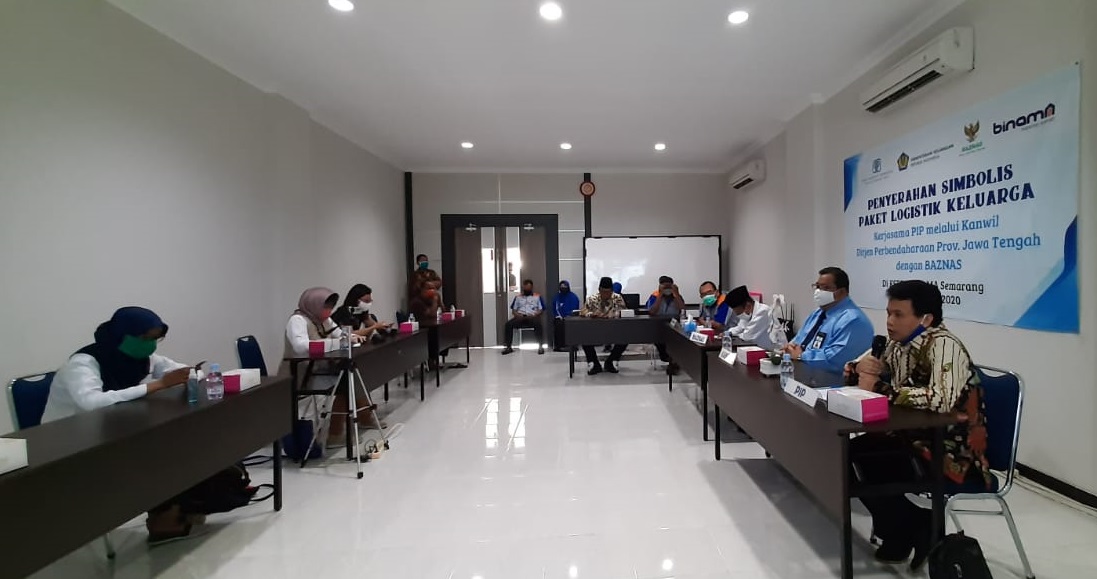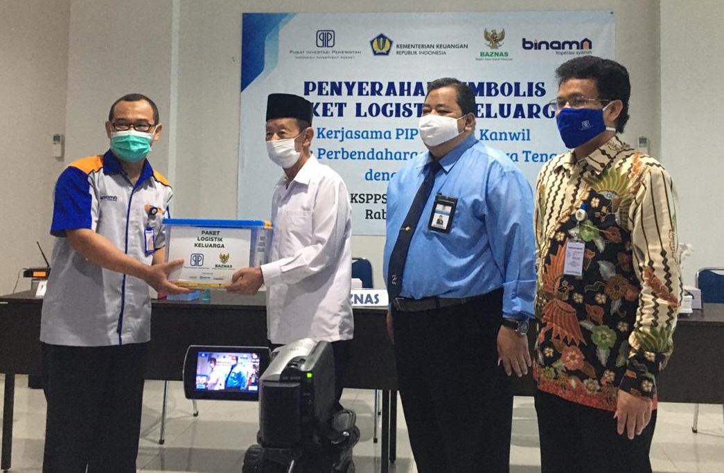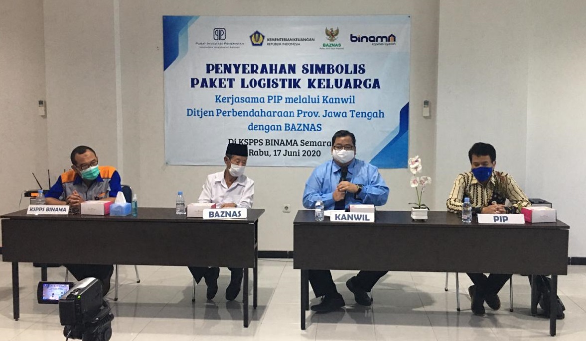 Acara penyerahan simbolis paket logistik keluarga yang dilaksanakan pada hari Rabu, 17 Juni 2020 bertempat di Kantor Koperasi BMT BINAMA Semarang, dihadiri oleh Kepala Kanwil DJPb Provinsi Jawa Tengah, Ketua BAZNAS Prov Jateng, dan Direktur Hukum dan Manajemen Risiko PIP.