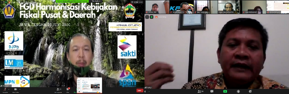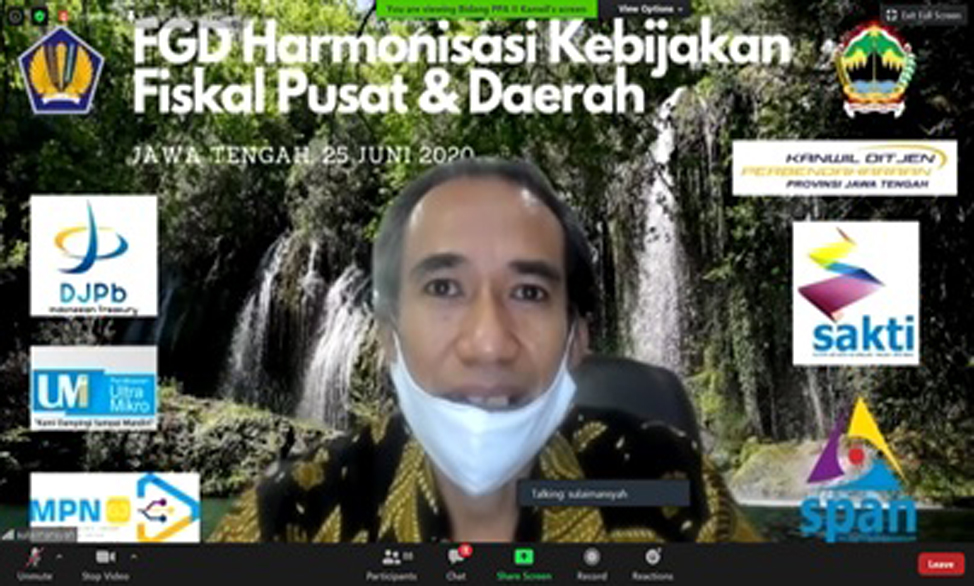 FGD yang diselenggarakan melalui media zoom tersebut dibuka oleh Sulaimansyah selaku Kepala Kanwil DJPb Provinsi Jateng. Melalui sambutannya dijelaskan bahwa sharing kebijakan pusat dan daerah sangat diperlukan sehingga dapat menguatkan peran dalam pengelolaan keuangan pusat dan daerah. Disampaikan juga bahwa saat ini terdapat 4 hal yang menjadi konsen pemerintah akibat dampak pandemi COVID-19 yaitu : bidang kesehatan, sosial, ekonomi dan keuangan. Berbagai langkah yang telah diambil oleh pemerintah, yaitu melalui refocusing program dan realokasi anggaran sebagai salah satu opsi utama serta kebijakan TKDD yang berupa penyesuaian alokasi TKDD 2020 dan refocusing penggunaan. Selanjutnya juga dilakukan program pemulihan ekonomi nasional sebagai bagian dari kebijakan extraordinary penanganan dampak COVID-19. Secara nasional pemerintah telah menganggarkan Rp677,20 Triliun untuk biaya penanganan COVID-19 yang meliputi bidang kesehatan, perlindungan sosial, insentif usaha, UMKM, pembiayaan korporasi serta sektoral K/L dan pemda.