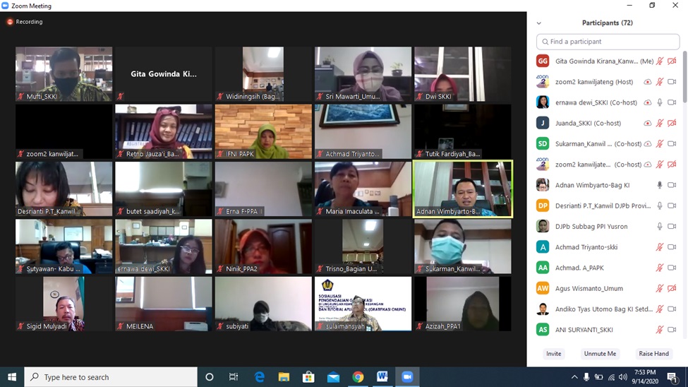 Semarang, Liputan djpb.kemenkeu.go.id/kanwil/jateng/id- Bidang Supervisi KPPN dan Kepatuhan Internal (SKKI) Kanwil DJPb Provinsi jawa Tengah menggelar sosialisasi daring gratifikasi dan tutorial aplikasi GOL melalui aplikasi zoom kepada seluruh pegawai Kanwil DJPb Provinsi Jawa Tengah sebagai bentuk komitmen dalam pengendalian gratifikasi di lingkungan Kanwil DJPb Provinsi Jawa Tengah dengan memperkuat budaya integritas.