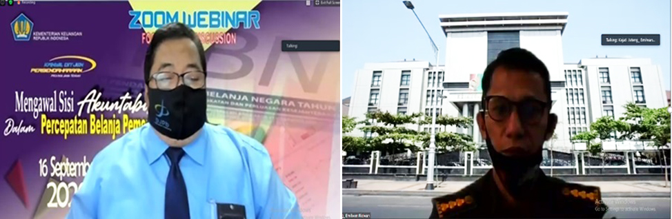 Semarang, Liputan djpb.kemenkeu.go.id/kanwil/jateng/id- Sejalan dengan hal tersebut, agar semua pihak memiliki sense of crisis yang sama, dan para pengelola APBN serta APBD memiliki keyakinan penuh dalam melakukan percepatan belanja Pemerintah, Kanwil Ditjen Perbendaharaan Prov. Jawa Tengah menyelenggarakan Focus Group Discussion (FGD) bertema “Mengawal Sisi Akuntabilitas dalam Percepatan Belanja Pemerintah”. Acara diselenggarakan secara daring menggunakan aplikasi zoom pada Rabu,16 September 2020.