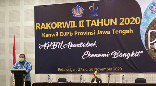 Liputan djpb.kemenkeu.go.id/kanwil/jateng/id- Judul diatas merupakan tagline acara Rapat Koordinasi Wilayah Semester II Tahun 2020 Kanwil DiJPb Provinsi Jawa Tengah yang dilaksanakan pada hari Jumat sampai dengan Sabtu, 27-28 November 2020 di Pekalongan yang bertempat di Kantor Pelayanan Perbendaharaan Negara (KPPN) Pekalongan. Acara dimulai sejak hari Jumat, 27 November 2020 pukul 18.30 WIB sampai dengan hari Sabtu, 28 Novermber pukul 16.00 WIB. Mengingat kondisi pandemic COVID-19 masih berlangsung, maka pelaksanaan rakorwil kali ini tetap menerapkan protocol Kesehatan secara ketat dengan tetap memakai masker, menjaga jarak, mencuci tangan secara teratur.