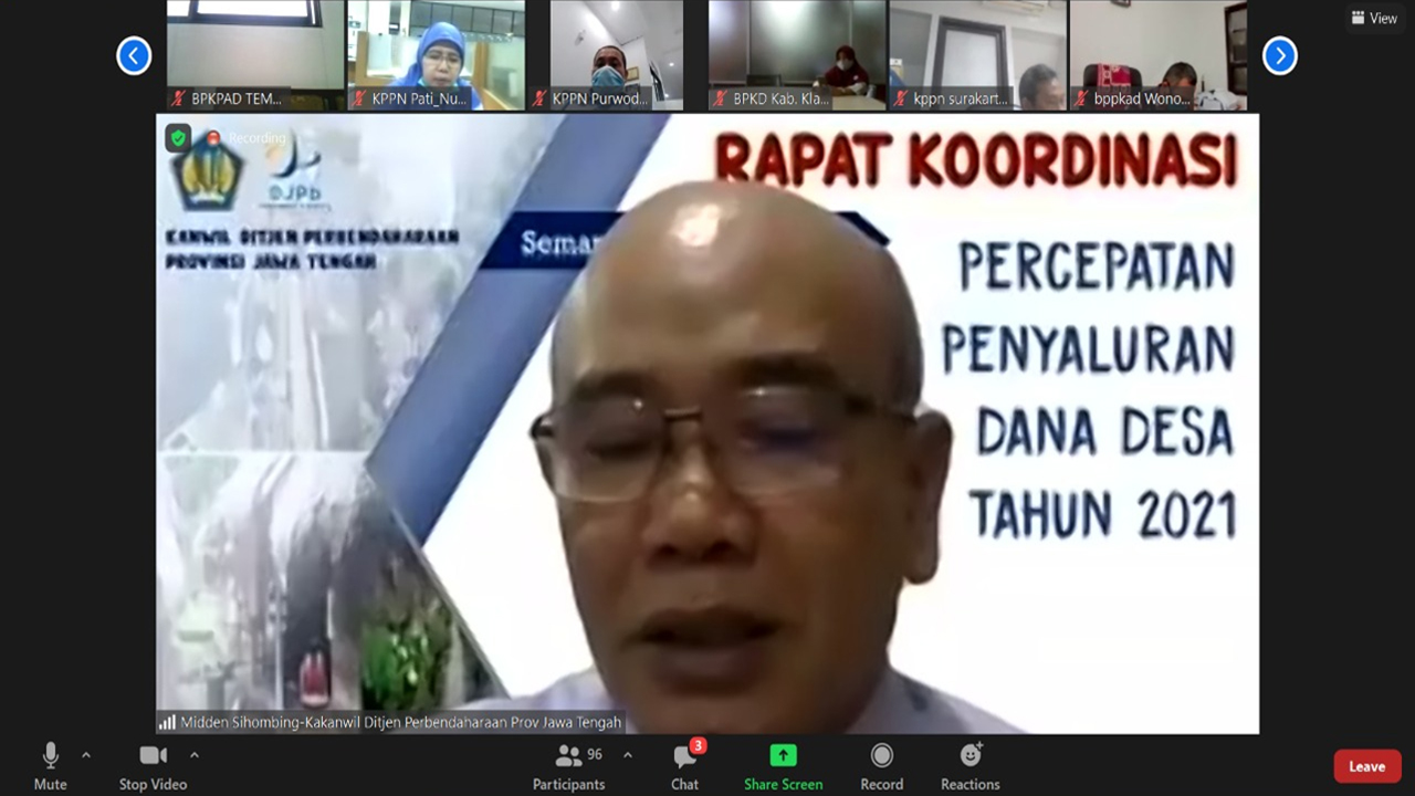 djpb.kemenkeu.go.id/kanwil/jateng/id - Pada hari Rabu, 10 Maret 2021 telah diselenggarakan Rapat Koordinasi Percepatan Penyaluran Dana Desa Tahun 2021 antara Kanwil DJPb Provinsi Jawa Tengah, KPPN, Dispermasdes dan BPKAD se-Jawa Tengah terkait percepatan penyaluran Dana Desa dan BLT Dana Desa tahun 2021 melalui media daring zoom mulai pukul 08.30 sampai dengan 12.00 WIB.