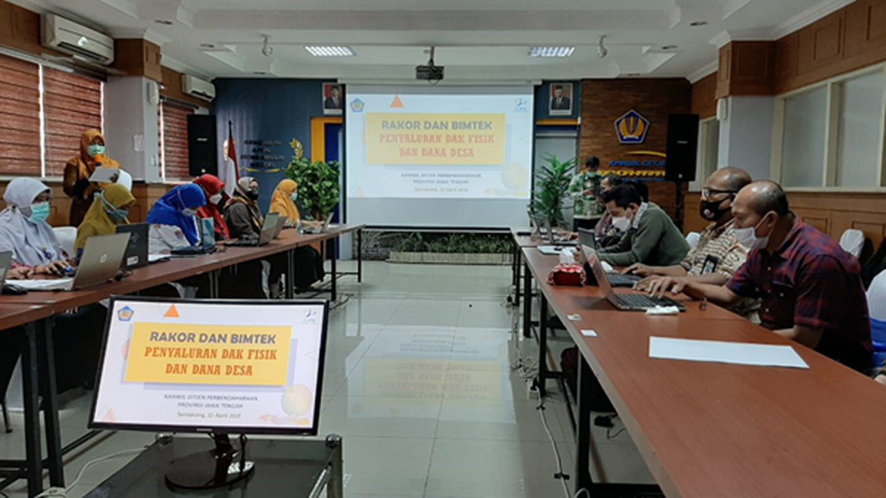djpb.kemenkeu.go.id/kanwil/jateng/id - Kantor Wilayah Direktorat Jenderal Perbendaharaan Provinsi Jawa Tengah pada hari Kamis, 22 April 2021 mengadakan Rapat Koordinasi dan Bimbingan Teknis Penyaluran Dak Fisik dan Dana Desa Tahun 2021 yang bertempat di Ruang Sinergi, Gedung Keuangan Negara Semarang I Lt.3 yang dihadiri para peserta dari perwakilan KPPN lingkup Kanwil Ditjen Perbendaharaan Provinsi Jawa Tengah serta Narasumber yang berasal dari Kantor Pusat Ditjen Perbendaharaan.