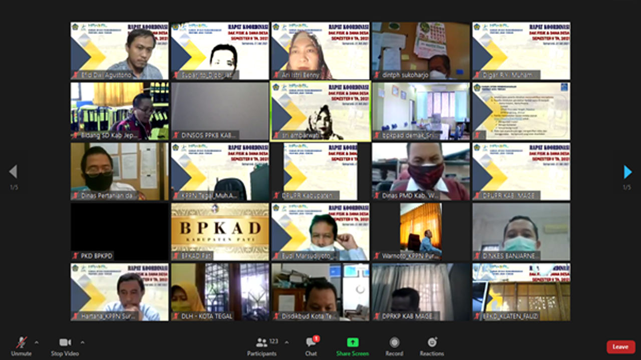 djpb.kemenkeu.go.id/kanwil/jateng/id - Kantor Wilayah Direktorat Jenderal Perbendaharaan Provinsi Jawa Tengah pada hari Rabu, 21 Juli April 2021 mengadakan Rapat Koordinasi Penyaluran Dak Fisik dan Dana Desa (DFDD) Tahun 2021 secara daring yang dihadiri para peserta dari pemerintah daerah Kab/Kota/Provinsi yang mengelola DFDD, para Kepala KPPN lingkup Kanwil Ditjen Perbendaharaan Provinsi Jawa Tengah serta Narasumber yang berasal dari Kantor Pusat Ditjen Perbendaharaan. Acara berlangsung mulai pukul 09.00 hingga pukul 12.00 WIB.