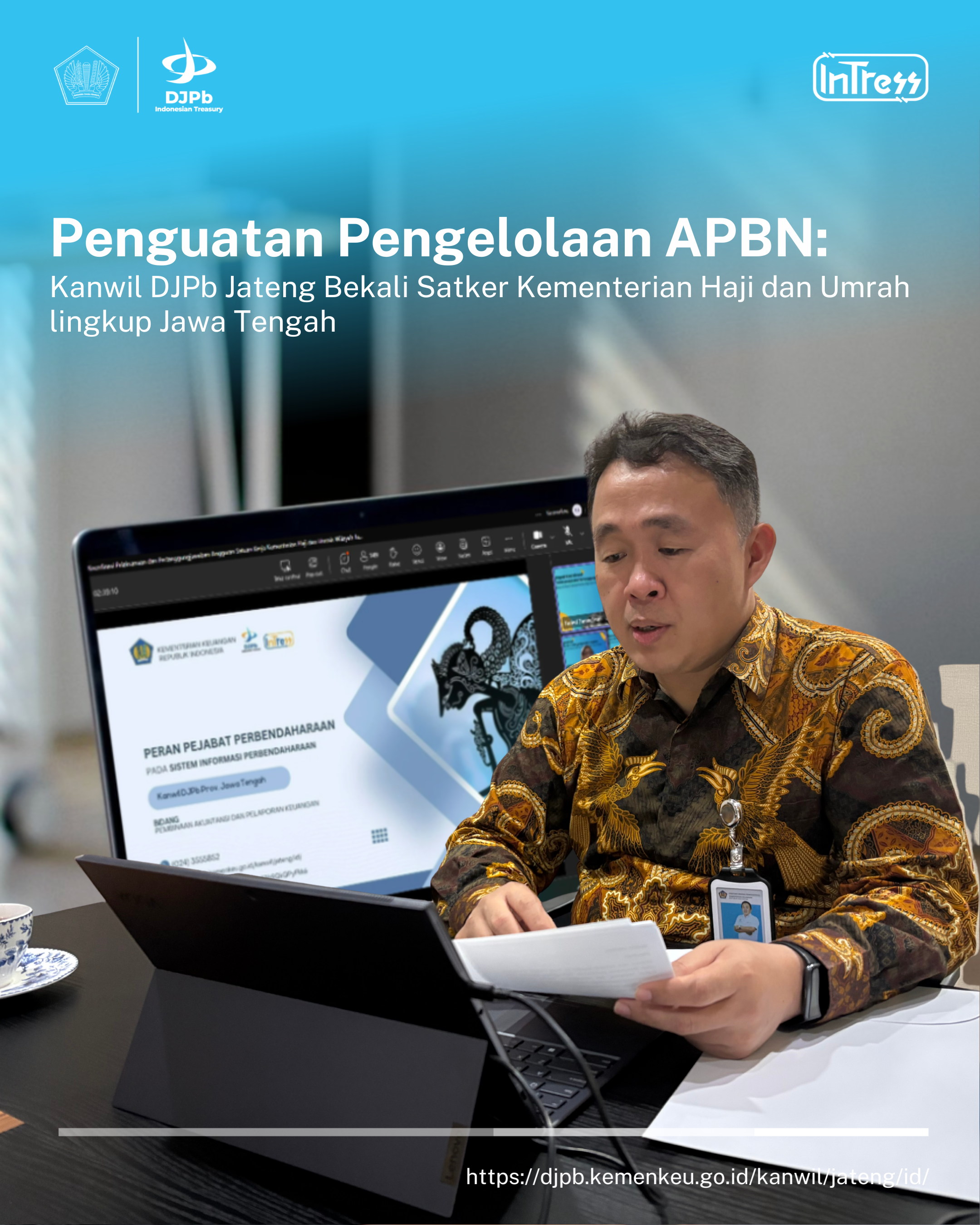 Kantor Wilayah Direktorat Jenderal Perbendaharaan (Kanwil DJPb) Provinsi Jawa Tengah menyelenggarakan kegiatan pembekalan pengelolaan keuangan negara bagi satuan kerja lingkup Kementerian Haji dan Umrah di wilayah Jawa Tengah. Kegiatan tersebut dilaksanakan secara daring pada tanggal 21 dan 23 April 2026 sebagai upaya meningkatkan pemahaman serta kesiapan satker dalam melaksanakan pengelolaan APBN secara tertib dan akuntabel.