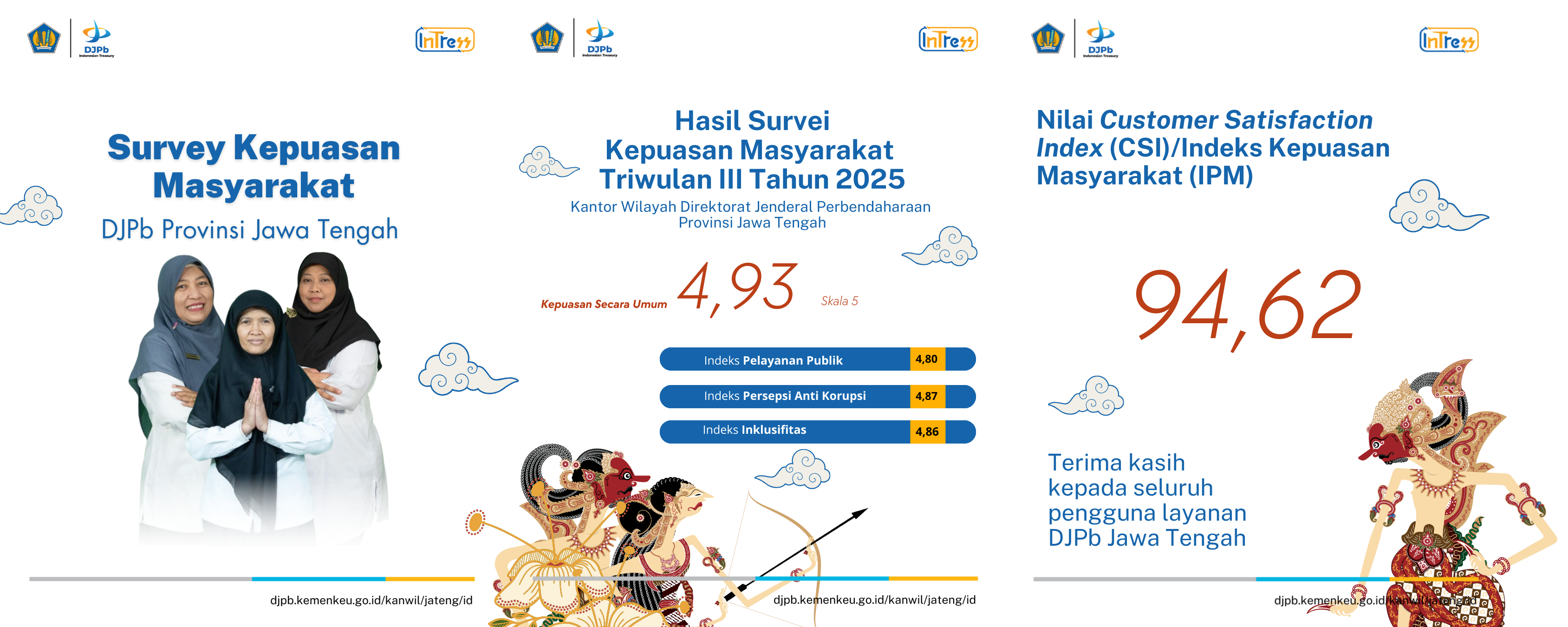 Hasil survei menunjukkan capaian yang sangat memuaskan dengan nilai 4,93 dari skala 5 yang mencerminkan apresiasi serta kepercayaan satuan kerja di lingkungan Kanwil DJPb Provinsi Jawa Tengah terhadap kualitas pelayanan kami.