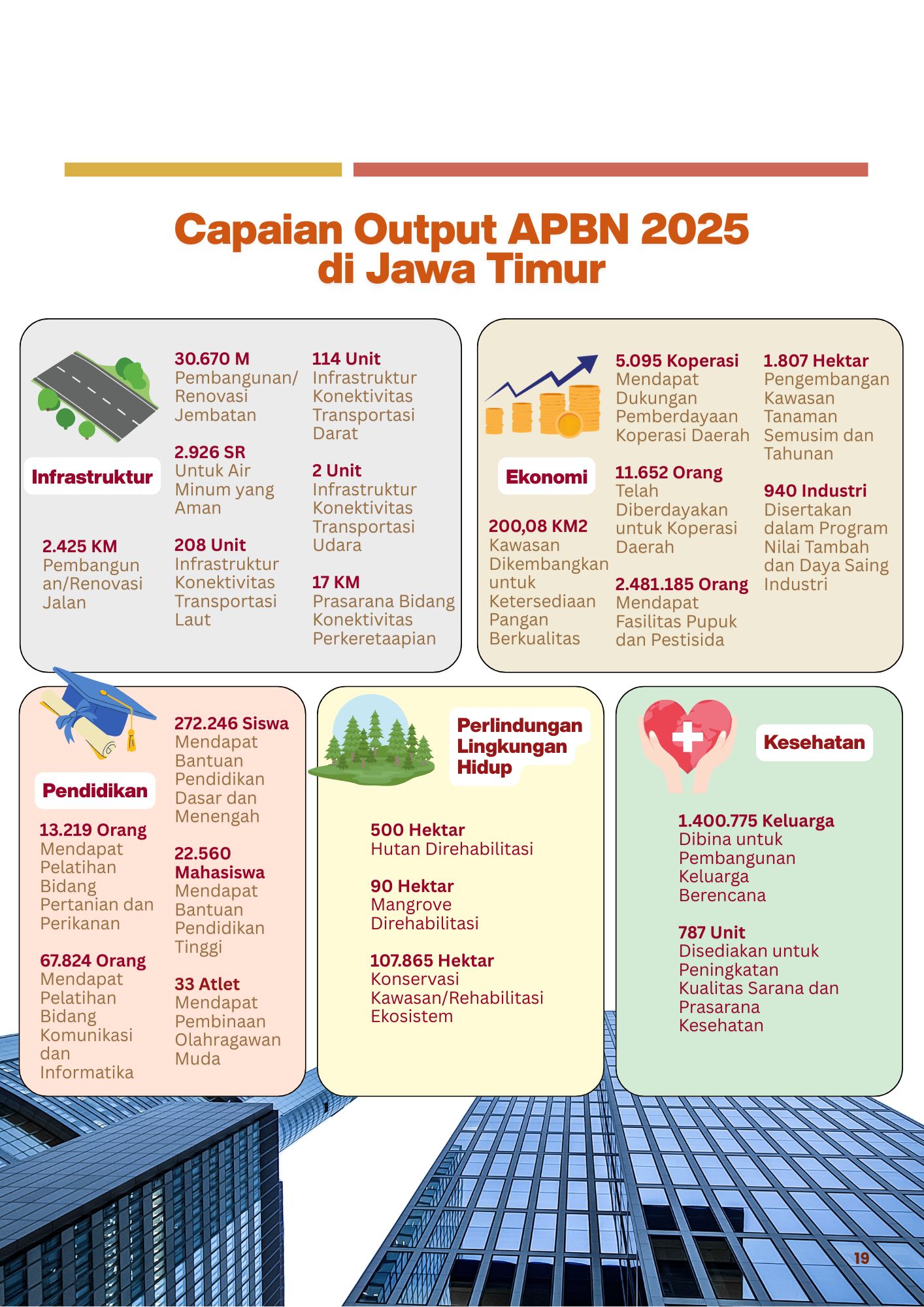 Secara keseluruhan, kinerja output APBN 2025 di Jawa Timur telah meletakkan fondasi yang kokoh: ekonomi yang tumbuh, rakyat yang terlindungi, alam yang lestari, dan budaya yang terjaga. Melalui peran Kanwil DJPb Provinsi Jawa Timur dalam mengawal akuntabilitas perbendaharaan, setiap rupiah uang rakyat dipastikan kembali memberi manfaat sebesar-besarnya bagi kemakmuran Bumi Majapahit.