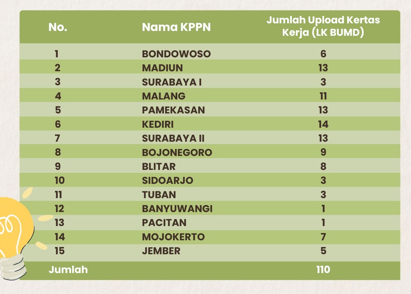Kanwil DJPb dan KPPN lingkup Wilayah Jawa Timur berkomitmen menyelesaikan semua tahapan penyusunan GFS Korporasi Publik di Jawa Timur mulai dari pengumpulan data LK BUMD Tahunan yang dilakukan Seksi Bank KPPN, dengan berkoordinasi ke pemerintah daerah selaku KPM atas BUMD di wilayahnya dengan jangka waktu maksimal 7 bulan setelah pelaporan terakhir. Pengisian kertas kerja dan penginputan data transaksi resiprokal pada SIKRI KP dilakukan Seksi Vera KPPN dan Dit APK maksimal 9 bulan setelah tahun pelaporan berakhir. Hasil upload data Laporan Keuangan BUMD (s.d tanggal 29 September 2025 tampak pada tabel berikut: