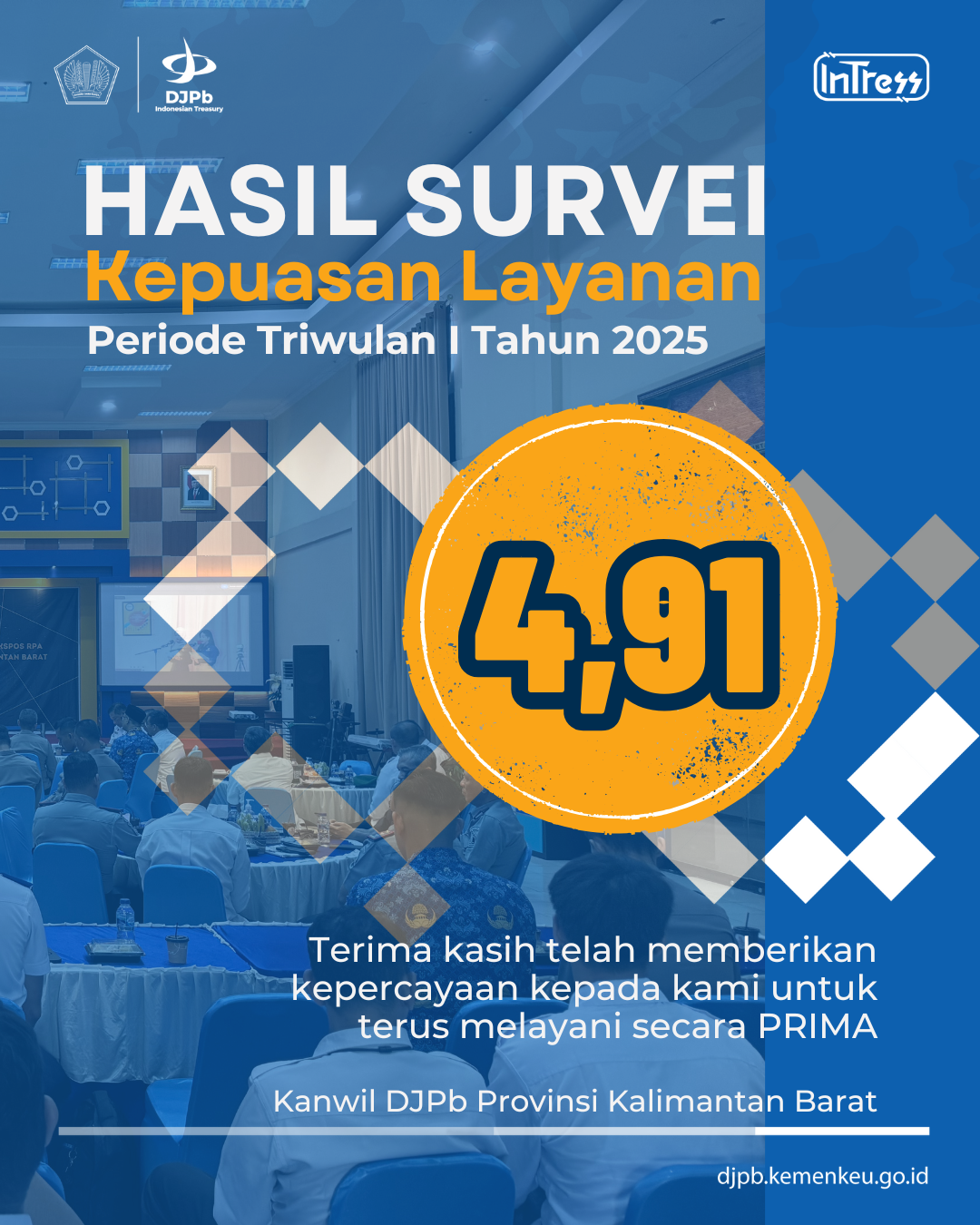 Kanwil DJPb Provinsi Kalimantan Barat melakukan Survey Kepuasan Layanan pada Triwulan I Tahun 2025 kepada stakeholder terhadap layanan yang dilaksanakannya. Hasil survei tersebut memperoleh hasil yang luar biasa yaitu mencapai 4,91 dari skala 5 yang menunjukkan konsistensi Kanwil DJPb Provinsi Kalimantan Barat dalam memberikan pelayanan prima.