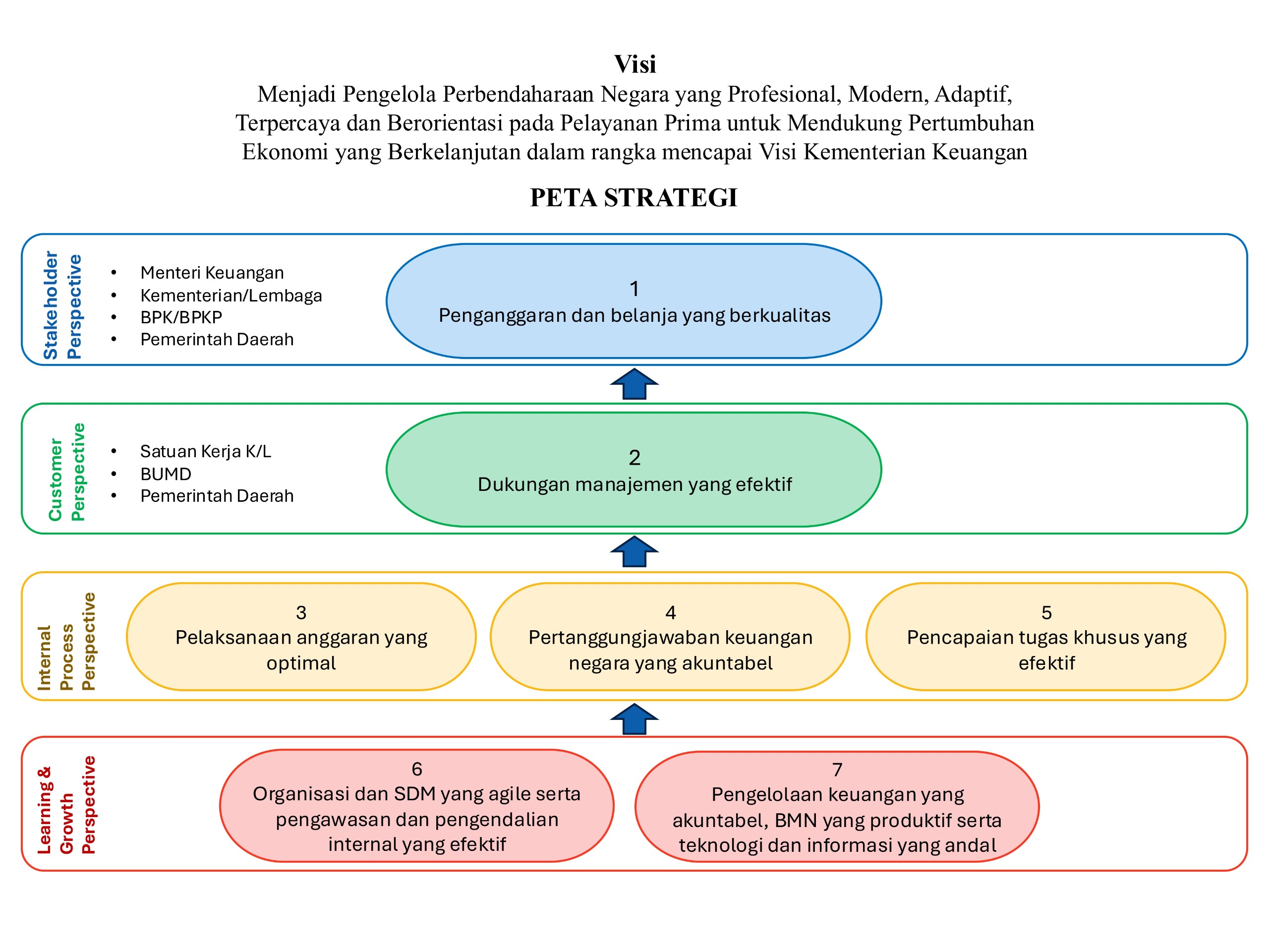 Peta Strategi adalah suatu dashboard yang memetakan sasaran strategis organisasi dalam suatu kerangka hubungan sebab akibat yang menggambarkan keseluruhan perjalanan strategi organisasi dalam mewujudkan visi dan misi. Peta strategi menggambarkan cara pandang organisasi dalam mengelola kinerjanya dari berbagai perspektif. Peta strategi di lingkungan Kementerian Keuangan secara umum menggunakan 4 (empat) perspektif, yaitu: