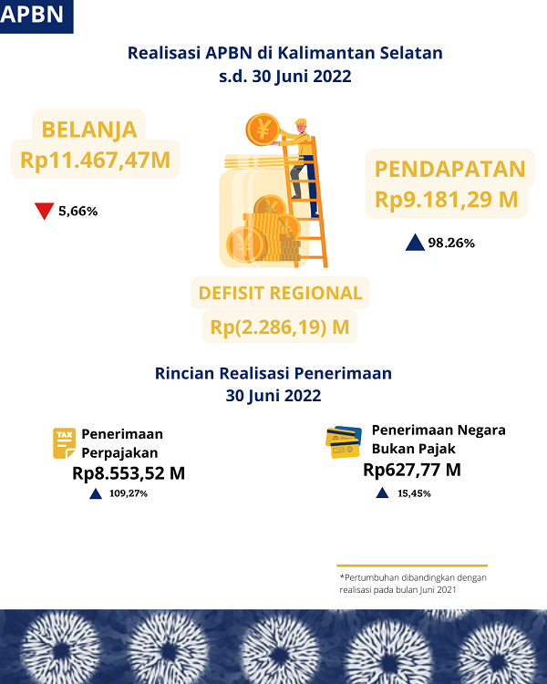 Capaian pendapatan negara di wilayah Kalimantan Selatan sangat dipengaruhi fluktuasi kegiatan perekonomian regional. Sampai dengan 30 Juni 2022, kondisi perekonomian masih menunjukkan tren positif dengan dominasi sektor pertambangan