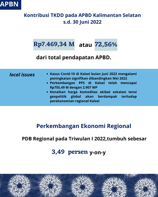 Untuk penyaluran Transfer ke Daerah dan Dana Desa (TKDD) di Kalimantan Selatan sampai dengan akhir Juni 2022 tercatat sebesar Rp 8.297,23 milyar atau 49,12 % dari pagu.