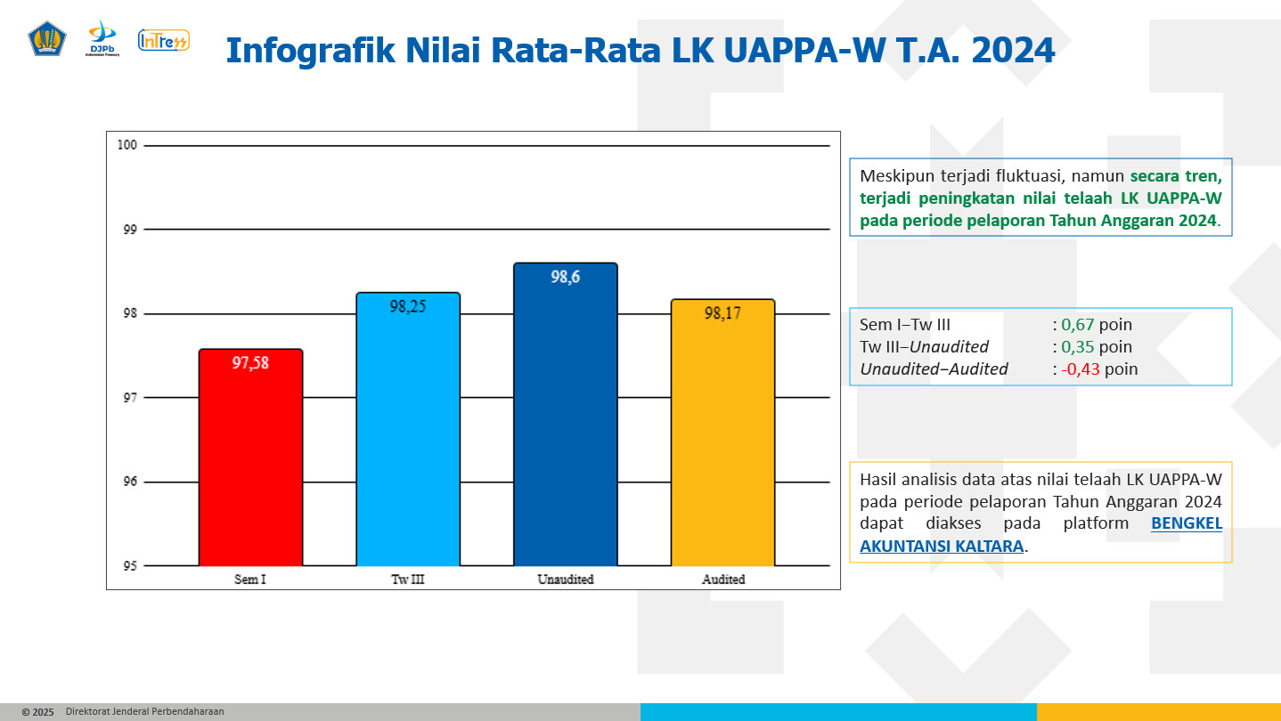 - Meskipun terjadi fluktuasi, namun secara tren, terjadi peningkatan nilai telaah Laporan Keuangan tingkat UAPPA-W pada periode pelaporan Tahun Anggaran 2024.