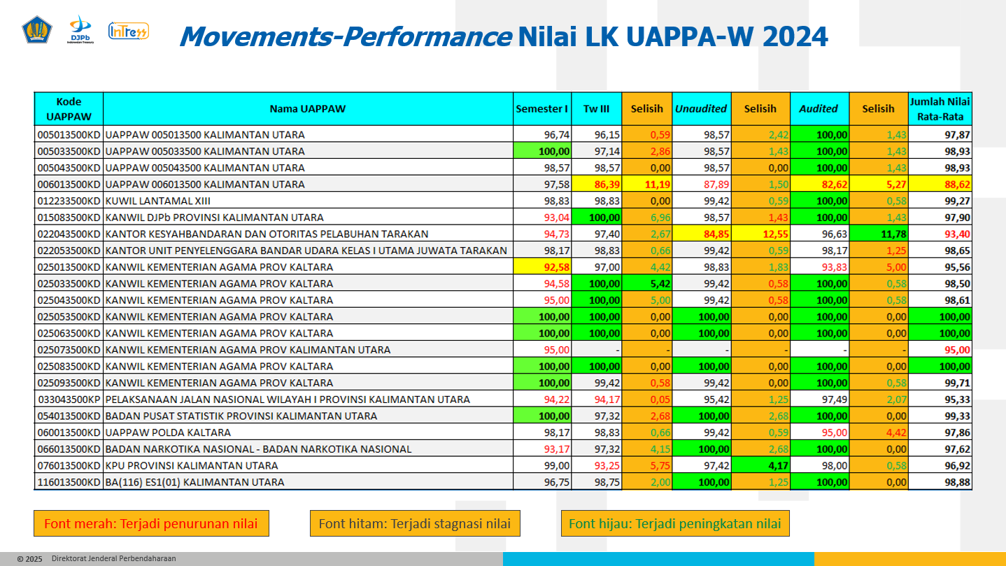 Capaian nilai telaah Laporan Keuangan tingkat UAPPA-W tahun anggaran 2024 pada Kanwil DJPb Provinsi Kalimantan Utara bukan hanya menunjukkan tingkat akurasi yang tinggi namun juga menunjukkan tren peningkatan nilai, membuktikan bahwa kerja nyata dan sinergi antara satuan kerja (UAKPA dan UAPPA-W), Kantor Pelayanan Perbendaharaan Negara (KPPN), dan Kanwil DJPb dalam mewujudkan pertanggungjawaban pengelolaan Anggaran Pendapatan dan Belanja Negara (APBN) yang transparan dan akuntabel, serta turut memberikan kontribusinya pada perolehan Opini Wajar Tanpa Pengecualian (WTP) dari BPK atas LKPP Tahun 2024 yang merupakan capaian kesembilan kalinya secara berturut-turut sejak Tahun Anggaran 2016.