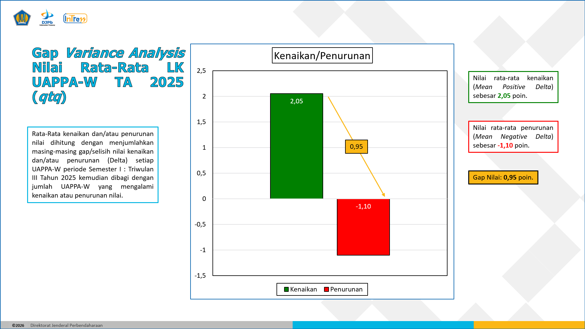 Dari 25 (dua puluh lima) UAPPA-W yang menjadi mitra kerja Kanwil DJPb Provinsi Kalimantan Utara, sebanyak 17 (tujuh belas) UAPPA-W berhasil meningkatkan nilai telaah laporan keuangan pada periode Triwulan III TA 2025, sementara 6 (enam) UAPPA-W mengalami penurunan nilai secara qtq. Poin rata-rata kenaikan nilai ke-17 UAPPA-W yang mengalami peningkatan (Mean Positive Delta) sebesar 2,05 poin. Sedangkan poin rata-rata penurunan (Mean Negative Delta) terhadap ke-6 UAPPA-W adalah -1,10 poin sehingga terdapat gap positif sebesar 0,95 poin sebagaimana digambarkan melalui grafik berikut: