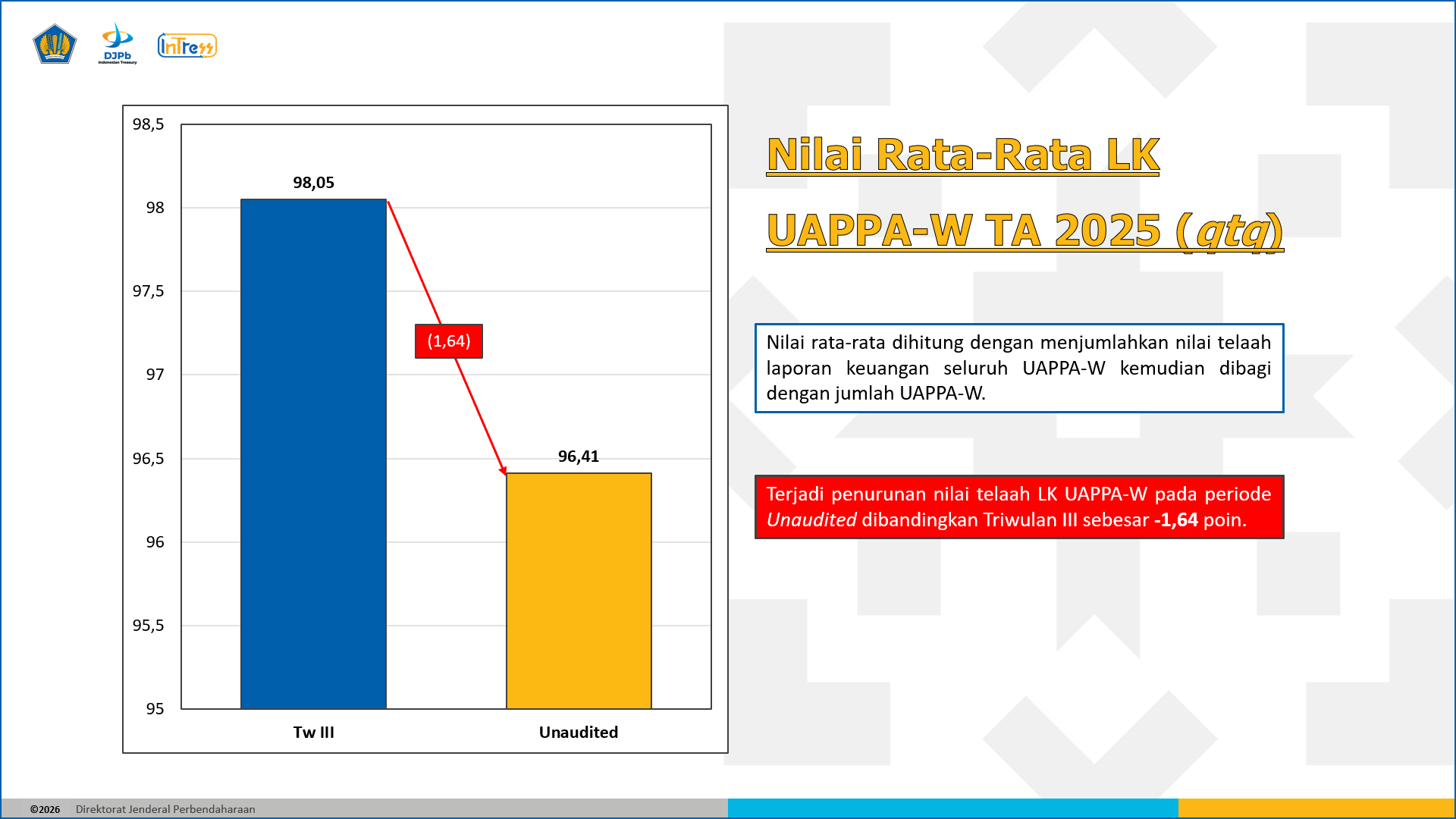 Meskipun terjadi penurunan nilai rata-rata telaah atas Laporan Keuangan tingkat Unit Akuntansi dan Pelaporan Keuangan Pembantu Pengguna Anggaran Wilayah (UAPPA-W) pada periode Tahun 2025 (Unaudited) dibandingkan periode Triwulan III Tahun 2025, penurunan tersebut terindikasi bukan disebabkan oleh penurunan kualitas laporan keuangan, melainkan lebih kepada kebijakan yang diterapkan pada periode penyusunan laporan keuangan Triwulan III 2025, di mana UAPPA-W tidak wajib menyampaikan Catatan atas Laporan Keuangan (CaLK). Seluruh Laporan Keuangan tingkat UAPPA-W periode Tahun 2025 (Unaudited) juga tetap akurat berdasarkan Indeks Kualitas Analisis Laporan Keuangan Tingkat UAPPA-W.