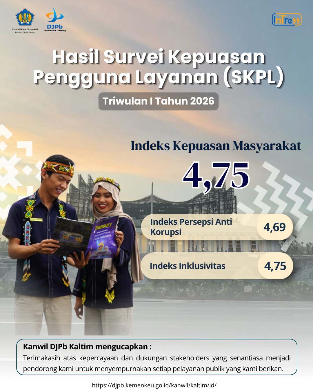 Dengan tagline CERDAS (Cekatan, Responsible, Disiplin, Akuntabel, dan Santun), Kanwil DJPb Provinsi Kalimantan Timur terus berupaya memberikan layanan terbaik dengan standar kualitas yang tinggi. Kanwil DJPb Kalimantan Timur menyampaikan terima kasih dan apresiasi kepada seluruh pengguna layanan dan pemangku kepentingan atas kepercayaan, dukungan, serta partisipasi aktif dalam pelaksanaan SKPL. Masukan dan penilaian yang diberikan menjadi bahan evaluasi yang sangat berharga dalam rangka peningkatan kualitas pelayanan di masa mendatang.