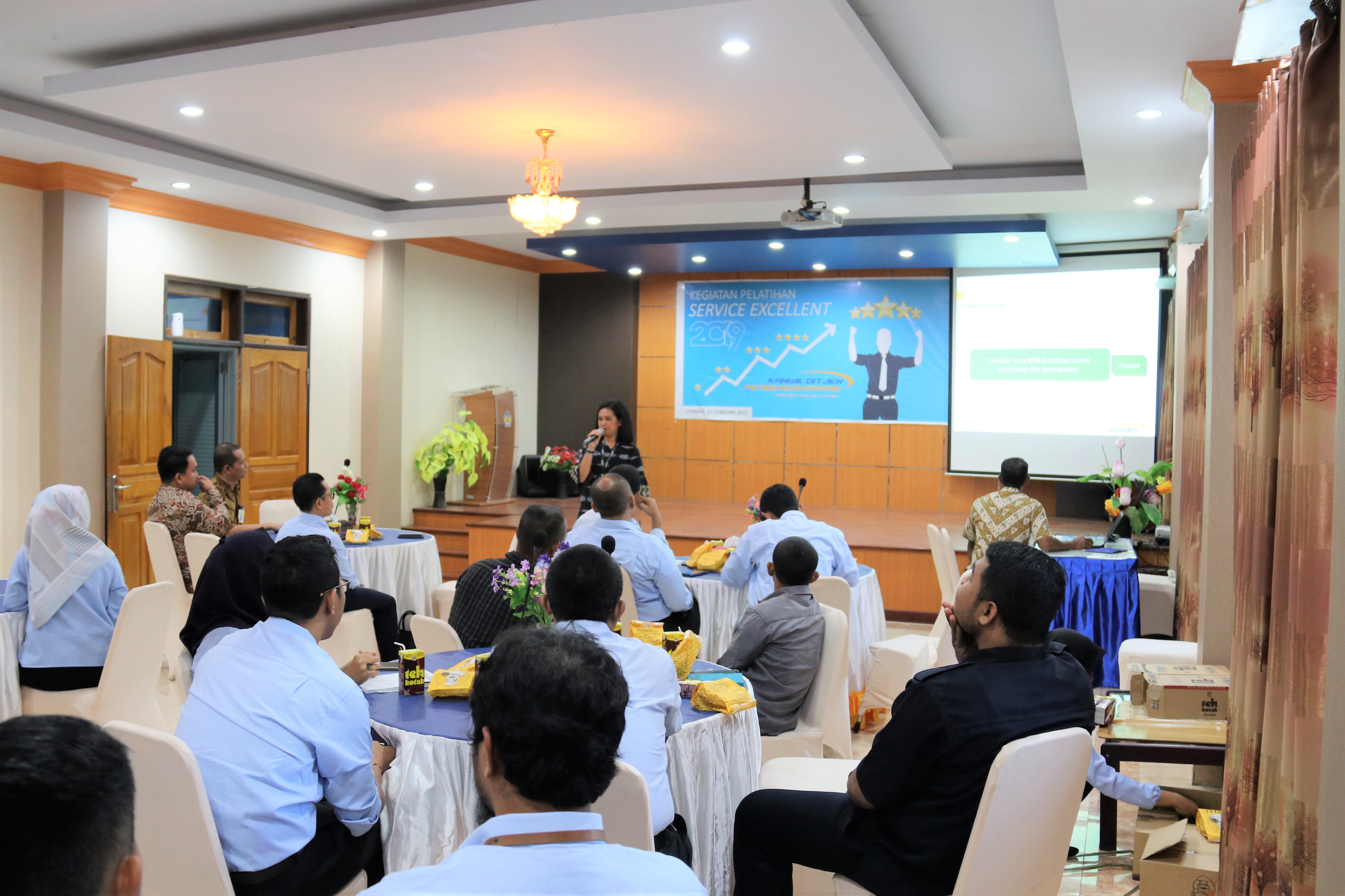 Kalimat Ibu Menteri Keuangan diatas menunjukkan komitmen pucuk pimpinan Kementerian Keuangan untuk selalu membaktikan seluruh pikiran, waktu bahkan tenaga untuk melayani yang terbaik kepada negara dan masyarakat. Tidak hanya komitmen pucuk pimpinan, seluruh jajaran Kanwil Direktorat Jenderal Perbendaharaan (DJPb) Provinsi Maluku Utara terus berusaha mewujudkan nilai-nilai pelayanan dalam pelaksanaan tugasnya. Hal tersebut melatarbelakangi diadakannya pelatihan Service Excellent kepada seluruh pejabat/pegawai Kanwil DJPb Maluku Utara pada Rabu (27/02) bertempat di Aula Kanwil. Pelatihan yang bertujuan meningkatkan kualitas layanan Kanwil DJPb kepada stakeholder dengan mengundang narasumber dari Bank Mandiri Cabang Ternate.