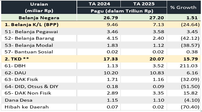 Pada Sidang Kabinet Paripurna perdana tanggal 23 Oktober 2024 dan tanggal 6 November 2024, Presiden Prabowo Subianto menekankan pentingnya efisiensi dalam mengelola anggaran. Instruksinya tegas, agar seluruh resources difokuskan pada pembangunan kesejahteraan rakyat. Presiden meminta para menteri untuk mengurangi kegiatan-kegiatan yang bersifat seremonial, seminar, dan perjalanan dinas. Selanjutnya Menteri Keuangan menerbitkan surat edaran nomor S-1023/MK.02/2024 tanggal 7 November 2024 dan ditujukan kepada Menteri Kabinet Merah Putih, Jaksa Agung, Kepala Kepolisian RI, kepala lembaga pemerintah non-kementerian, dan pimpinan kesekretariatan lembaga negara. Melalui surat tersebut, Menteri Keuangan menyampaikan kepada Menteri/Pimpinan Lembaga untuk melakukan penghematan sebesar minimal 50% dari sisa pagu Belanja Perjalanan Dinas dengan tetap menjaga efektivitas pencapaian target sasaran program pada masing-masing Kementerian/Lembaga.