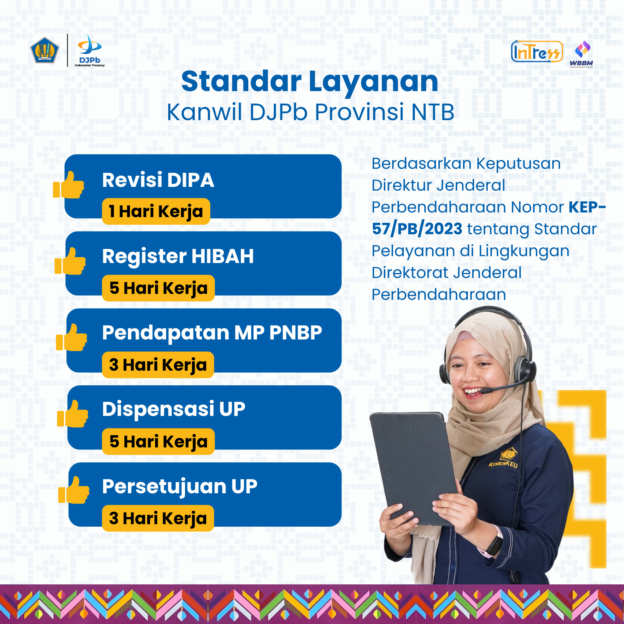 Sebagai bentuk komitmen dalam penyelenggaraan pelayanan publik yang profesional dan sesuai dengan prinsip pemerintahan yang baik, Direktorat Jenderal Perbendaharaan telah menetapkan KEP-83/PB/2025 tentang Standar Pelayanan di Lingkungan Direktorat Jenderal Perbendaharaan. Standar ini bertujuan untuk memberikan kepastian atas hak dan kewajiban para pihak serta menjadi pedoman dalam mewujudkan pelayanan yang transparan, efektif, dan berkualitas bagi para pengguna layanan.